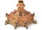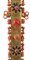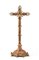 In rame dorato al mercurio; la croce è inserita su un basamento ottagonale gradinato sorretto da otto sfingi alate; tale base è ornata a retroincastro con puntini, baccelli e teste di cherubino in corallo Mediterraneo (Corallium Rubrum), componente fondamentale dell'arte Barocca siciliana, e smalti blu. La croce è tutta contornata da elementi in corallo fissati al supporto con pernetti, nonchè da piccole roselline in corallo circondate da petali in smalto blu; ai lati delle braccia e sulla sommità è presente una decorazione a merletto in smalti bianchi e blu. La scultura del Cristo, forse di epoca succcessiva, presenta una lunga e ricca veste a merletto quasi sacerdotale, che copre quasi interamente le gambe; tale rappresentazione riprende quella del Cristo di Scicli (città tardo-barocca a Sud-Est della Sicilia), il "Crocifisso con la Veste ", una tela di origini spagnole datata 1669 conservata nella sagrestia della chiesa di San Giovanni Evangelista. La presenza del teschio in basso richiama la tradizione secondo cui la croce fu posta nel luogo dove era sepolto Adamo, così simbolicamente la passione del Cristo libera gli uomini dalla morte di Adamo e quindi dal peccato originale. I corallari trapanesi dal XV al XVII secolo diventarono famosi per la loro bravura in tutto il bacino del Mediterraneo realizzando gioielli, oggetti sacri, cornici e i celebri presepi dove il corallo è ulteriormente impreziosito da oro, argento, smalti e pietre preziose. Dimensioni 19 x 16 cm, altezza 52 cm. Stato di conservazione: ***discreto (difetti e mancanze).