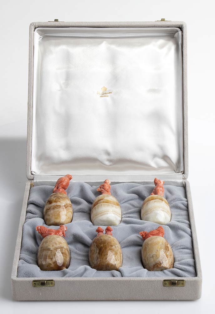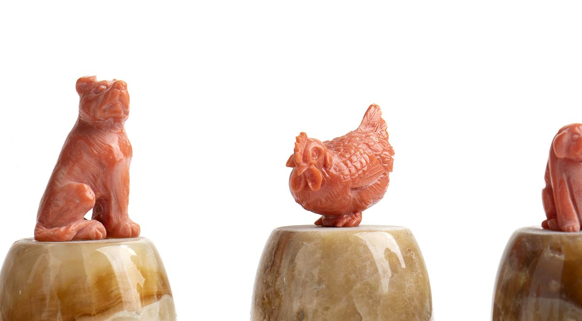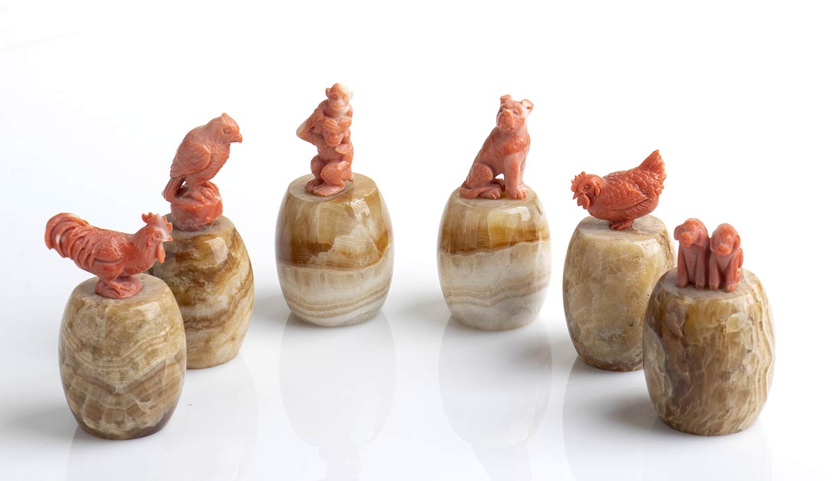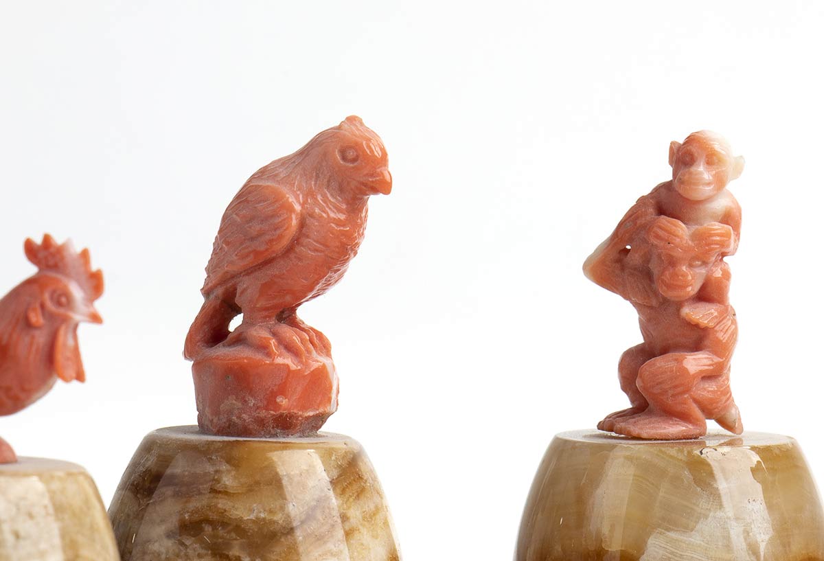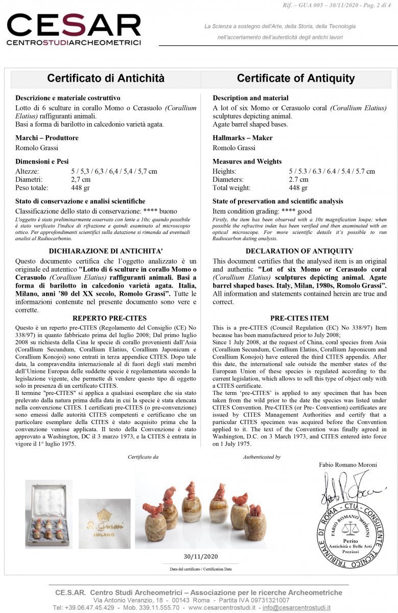 Lotto di 6 sculture in corallo Momo o Cerasuolo (Corallium Elatius) raffiguranti animali. Basi a forma di barilotto in calcedonio varietà agata. Romolo Grassi Milano anni '80. Altezze 5 - 5,3 - 6,3 - 6,4 - 5,4 - 5,7 cm; diametro 2,7 cm. Peso totale 448 gr. Stato di conservazione: *****ottimo. Certificato di Autenticità Ce.S.Ar.