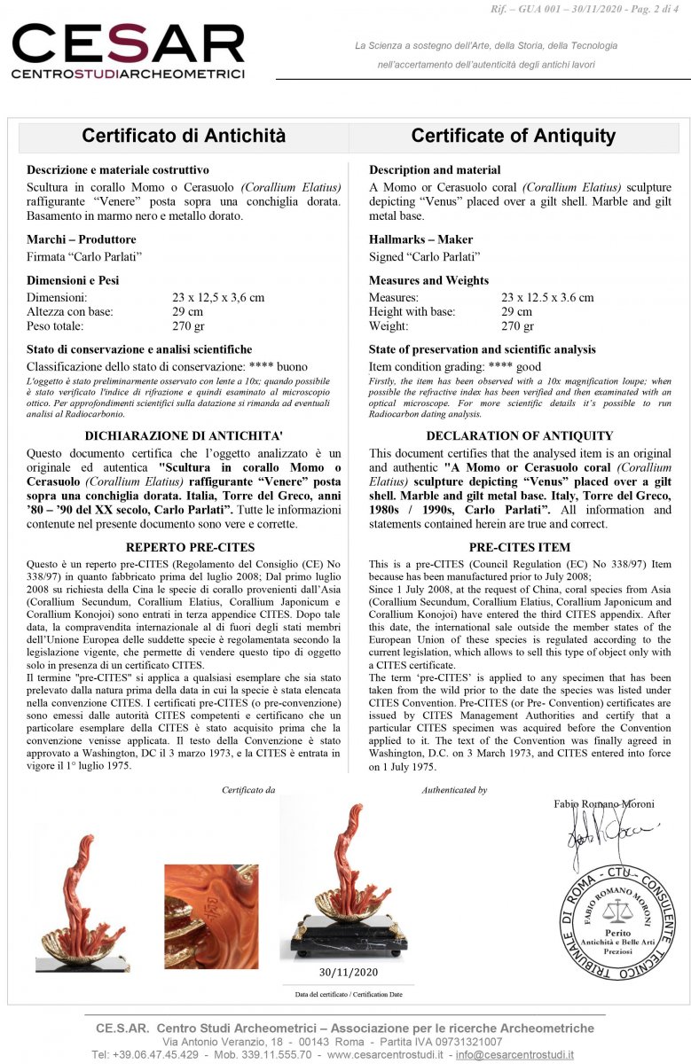 Scultura in Momo o Cerasuolo (Corallium Elatius) raffigurante una venere. Firmata "Parlati", Carlo Parlati, Torre del Greco anni '80 / '90. Base in marmo nero e metallo dorato. Dimensioni senza base 12,5 x 3,6 cm, altezza 23 cm. Dimensioni con base lunghezza 21,5 cm, altezza 29 cm. Peso 270 gr. Stato di conservazione: *****ottimo. Certificato di Autenticità Ce.S.Ar.