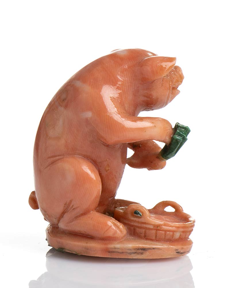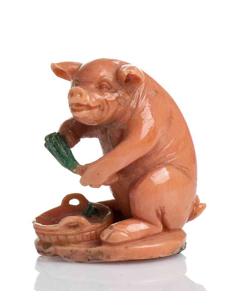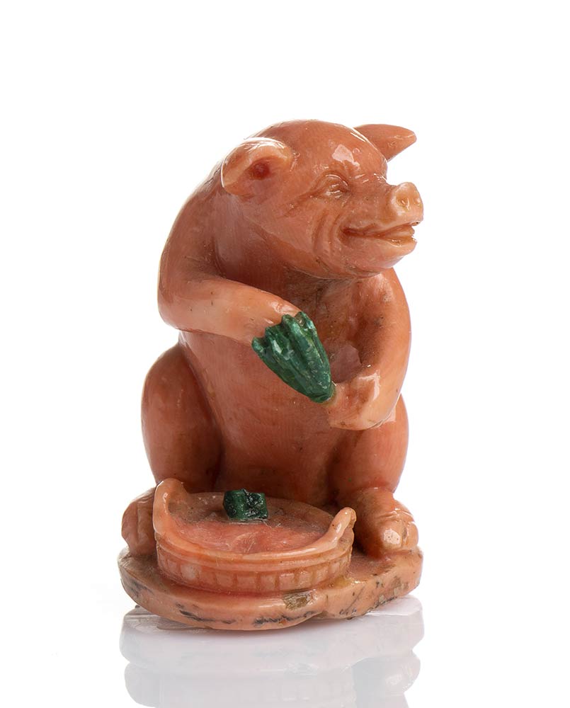 Scultura in corallo Momo o Cerasuolo (Corallium Elatius) raffigurante un maialino. Manifattura Guarracino, Torre del Greco. Dimensioni 30 x 20 mm, altezza 37 mm. Peso 23,5 gr. Stato di conservazione: *****ottimo.
