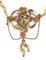 Montantura in oro a motivi geometrici con pendente a volute incastonato con sfere di corallo Mediterraneo (Corallium Rubrum). Punzonata con marchio italiano non leggibile, oro a basso titolo. Lunghezza catena 47 cm, altezza pendente 5,3 cm. Peso 18,9 gr. Stato di conservazione: ****buono.