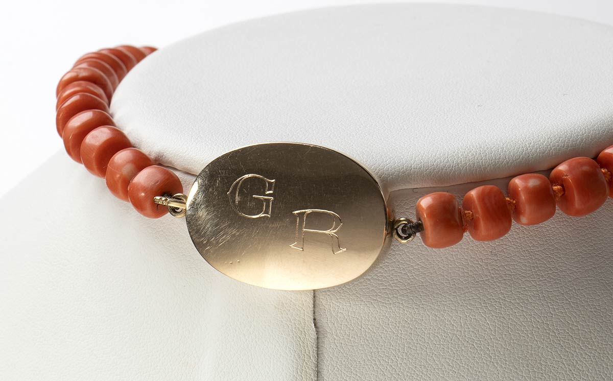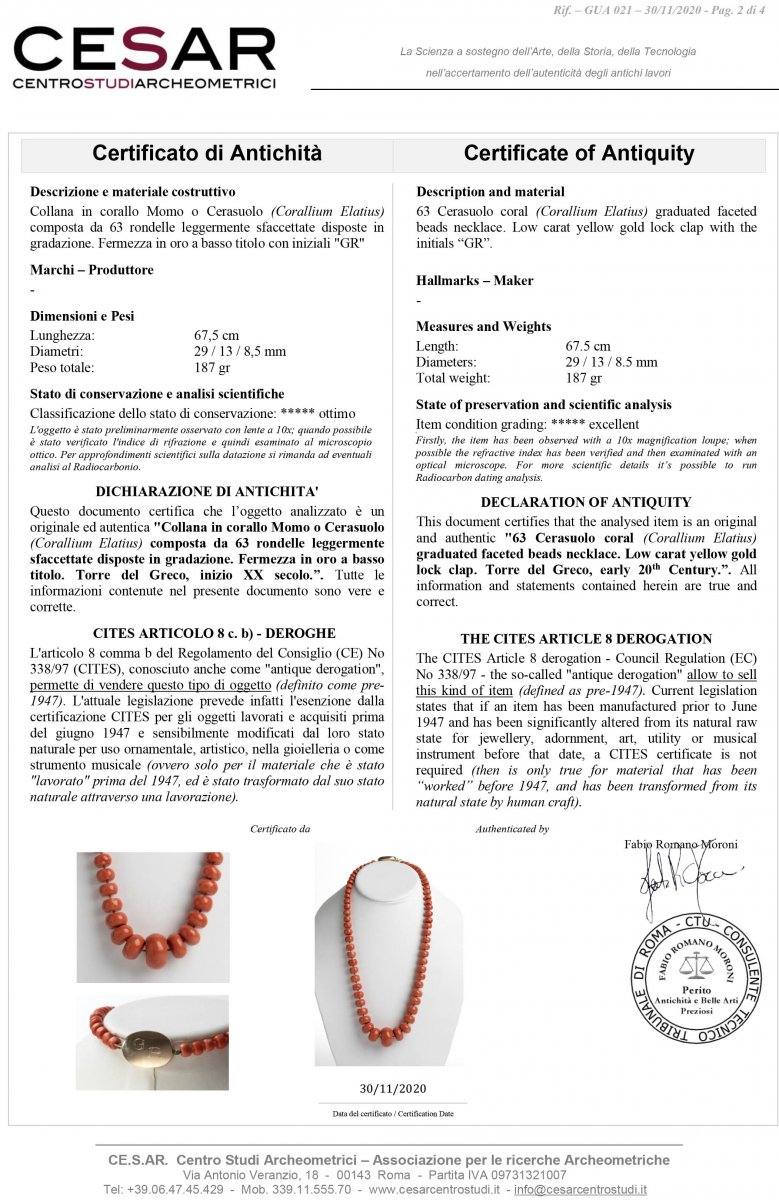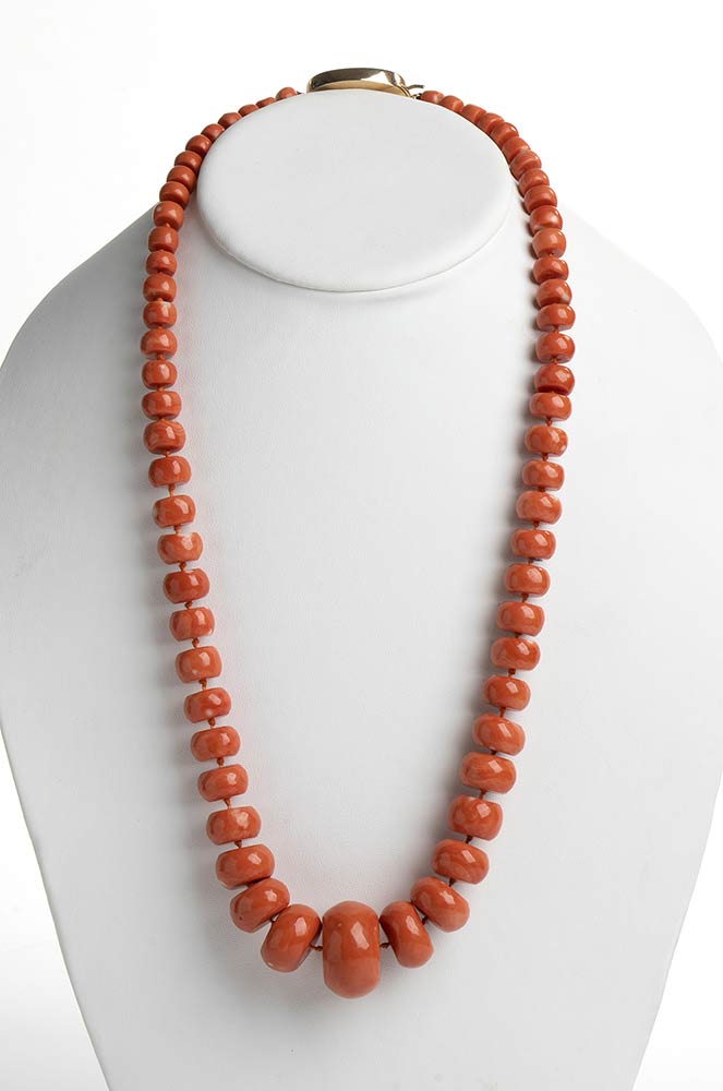 Collana in corallo Momo o Cerasuolo (Corallium Elatius) composta da 63 rondelle leggermente sfaccettate disposte in gradazione. Fermezza in oro a basso titolo con iniziali "GR", non punzonata. Torre del Greco, inizio XX secolo. Lunghezza 67,5 cm, diametri sfere 29 - 13 - 8,5 mm. Peso totale 187 gr (inclusa chiusura). Stato di conservazione: *****ottimo. Certificato di Antichità Ce.S.Ar.
