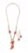In oro giallo 14k, con pendenti in corallo Cerasuolo (Corallium Elatius) intagliato a forma di rose. Lunghezza 37 cm. Peso 10,29 gr. Stato di conservazione: ****buono. Certificato di Autenticità Ce.S.Ar.