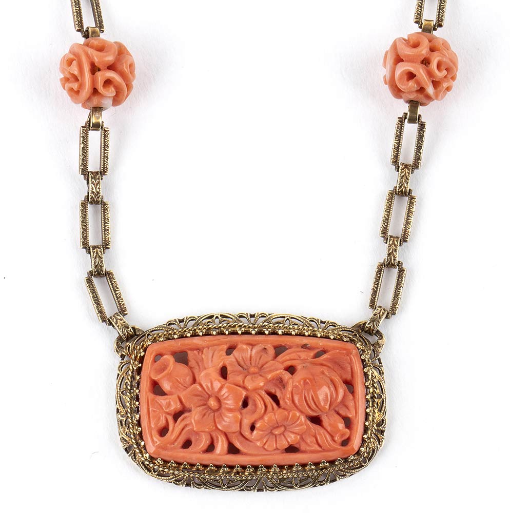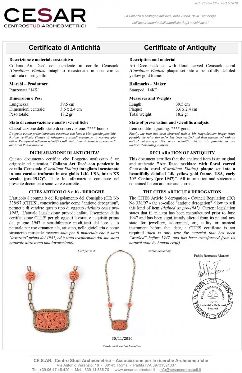 Con pendente in corallo Cerasuolo (Corallium Elatius) intagliato e incastonato in una cornice traforata in oro giallo. Punzonata "14K". Dimensioni pendente 36 x 24 mm. Lunghezza 39,5 cm. Peso 18,2 gr. Stato di conservazione: ****buono. Certificato di Autenticità Ce.S.Ar.