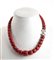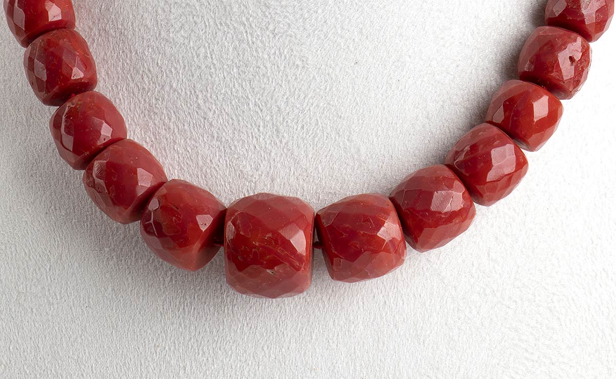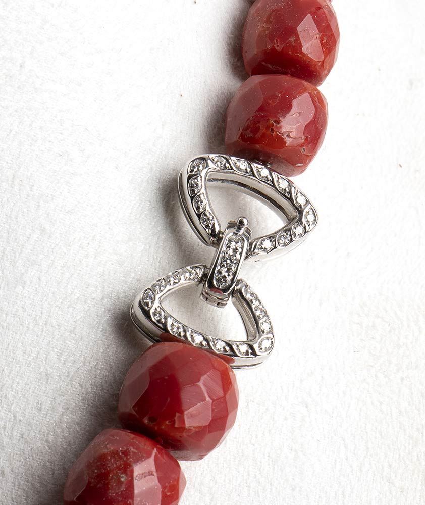 Collana ad un filo di barilotti sfaccettati di corallo Mediterraneo (Corallium Rubrum) disposti in gradazione. Chiusura in oro bianco 18k con diamanti di forma rotonda taglio brillante 0,30 ct G-H VS. Punzonato "750". Diametro barilotti 20 - 13 - 8 mm. Lunghezza 49 cm. Peso totale 107 gr. Stato di conservazione: *****ottimo.