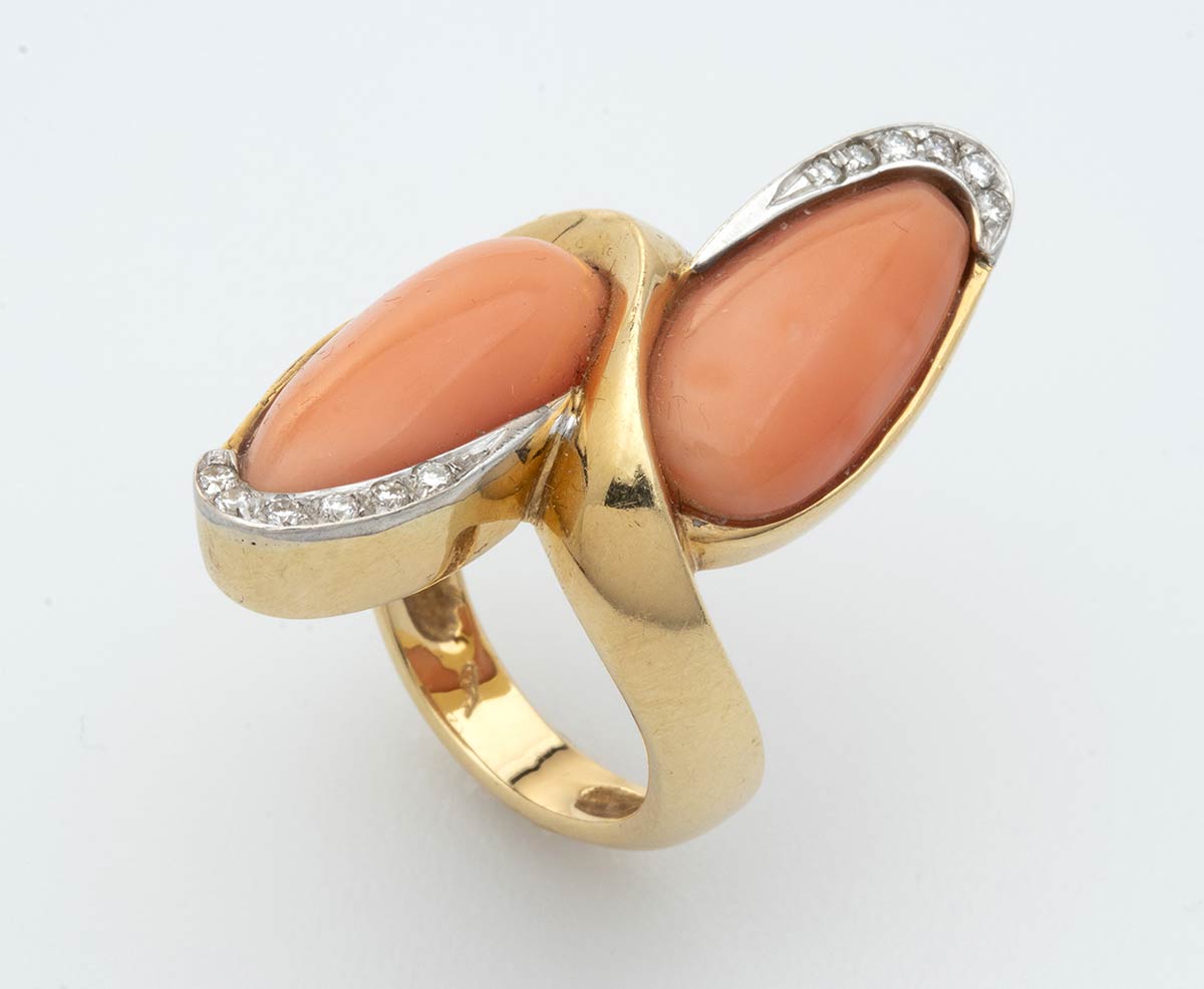 In oro giallo, corallo Cerasuolo (Corallium Elatius) e diamanti taglio brillante 0,12 ct G-H VVS-VS. Punzonato "750". Dimensioni fronte 33,8 x 21,3 mm. Peso 11,7 gr. Misura anello IT 12. Stato di conservazione: ****buono. Certificato di Autenticità Ce.S.Ar.