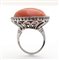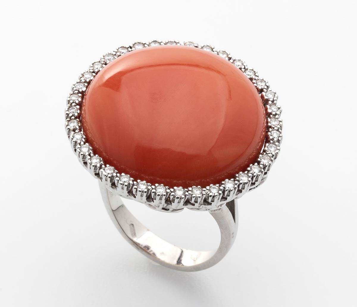 Anello in oro bianco, brillanti e corallo Cerasuolo (Corallium Elatius). Punzonato "750", Italia dopo il 1968. Brillanti taglio rotondo 1,10 ct G-H VVS-IS. Diametro 29,5 mm. Peso totale 22 gr. Misura anello IT 17. Stato di conservazione: ****buono. Certificato di Autenticità Ce.S.Ar.