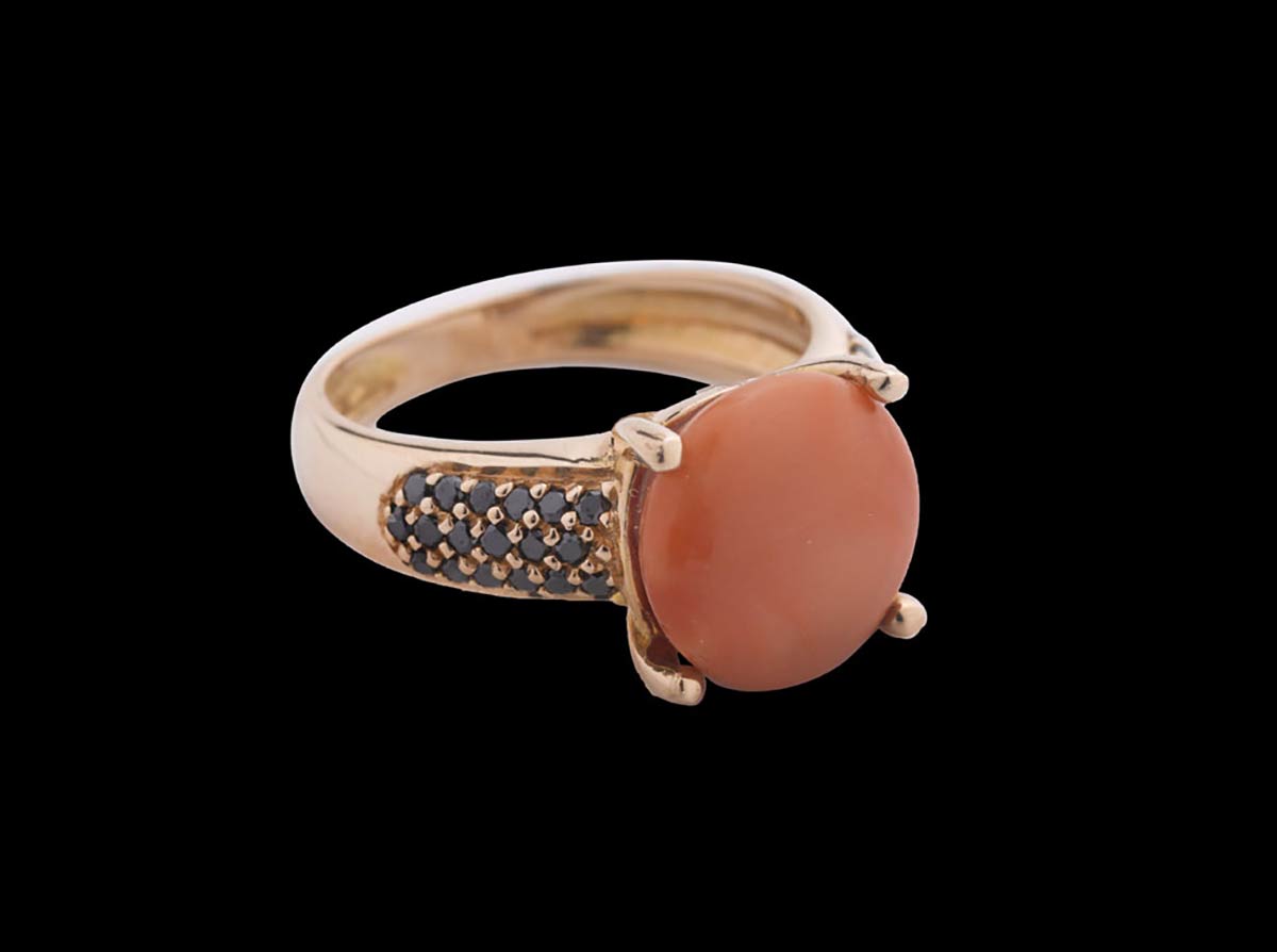 Anello in corallo Cerasuolo e diamanti neri - Manifattura Ascione, Torre del Greco
