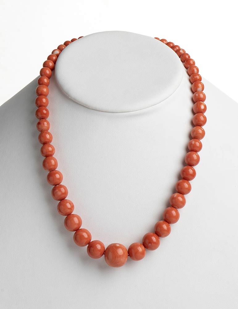 Collana in corallo Momo o Cerasuolo (Corallium Elatius) composta da 53 sfere lisce disposte in gradazione. Senza fermezza. Manifattura Guarracino, Torre del Greco. Lunghezza 50 cm, diametri sfere 8 - 12 - 18 mm. Peso totale 83 gr. Stato di conservazione: *****ottimo.