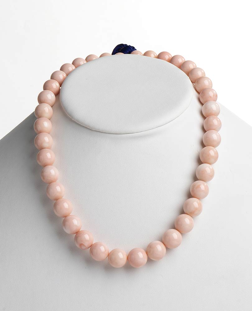 Collana in Bokè o Pelle d'angelo (Corallium Secundum) composta da 39 sfere lisce disposte in gradazione. Senza fermezza. Manifattura Guarracino, Torre del Greco. Lunghezza 48,5 cm, diametri sfere 11 - 13 - 14 mm. Peso totale 114,5 gr. Stato di conservazione: *****ottimo.