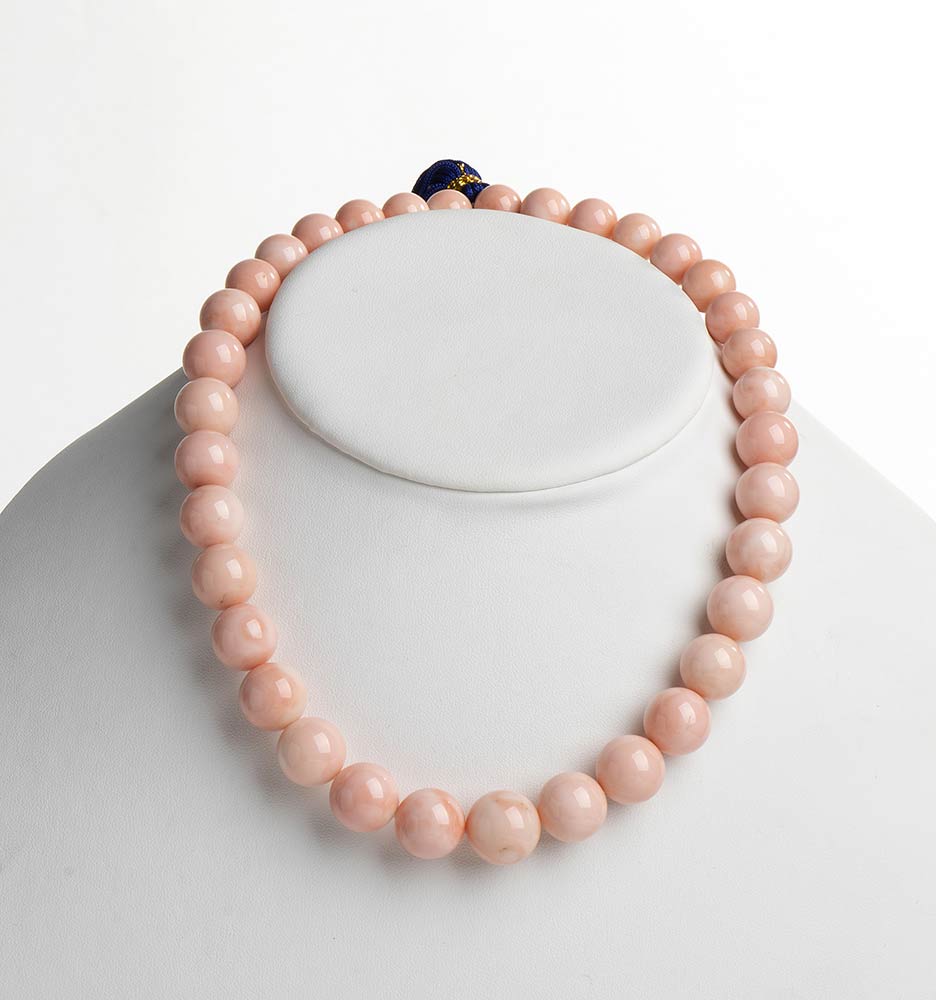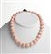 Collana in Bokè o Pelle d'angelo (Corallium Secundum) composta da 35 sfere lisce disposte in gradazione. Senza fermezza. Manifattura Guarracino, Torre del Greco. Lunghezza 45,5 cm, diametri sfere 15,5 -13 - 11 mm. Peso totale 112 gr. Stato di conservazione: *****ottimo.