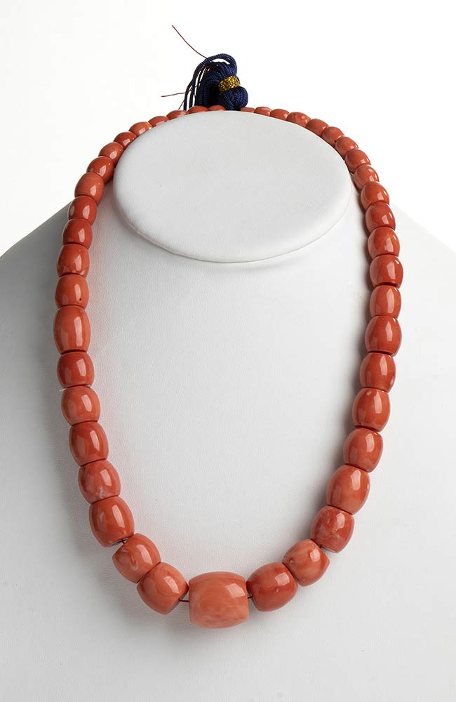 Collana in corallo Momo o Cerasuolo (Corallium Elatius) composta da 44 barilotti lisci disposti in gradazione. Senza fermezza. Manifattura Guarracino, Torre del Greco. Lunghezza 54,5 cm, diametri sfere 22 - 15 - 7 mm. Peso totale 182,8 gr. Stato di conservazione: *****ottimo.