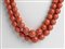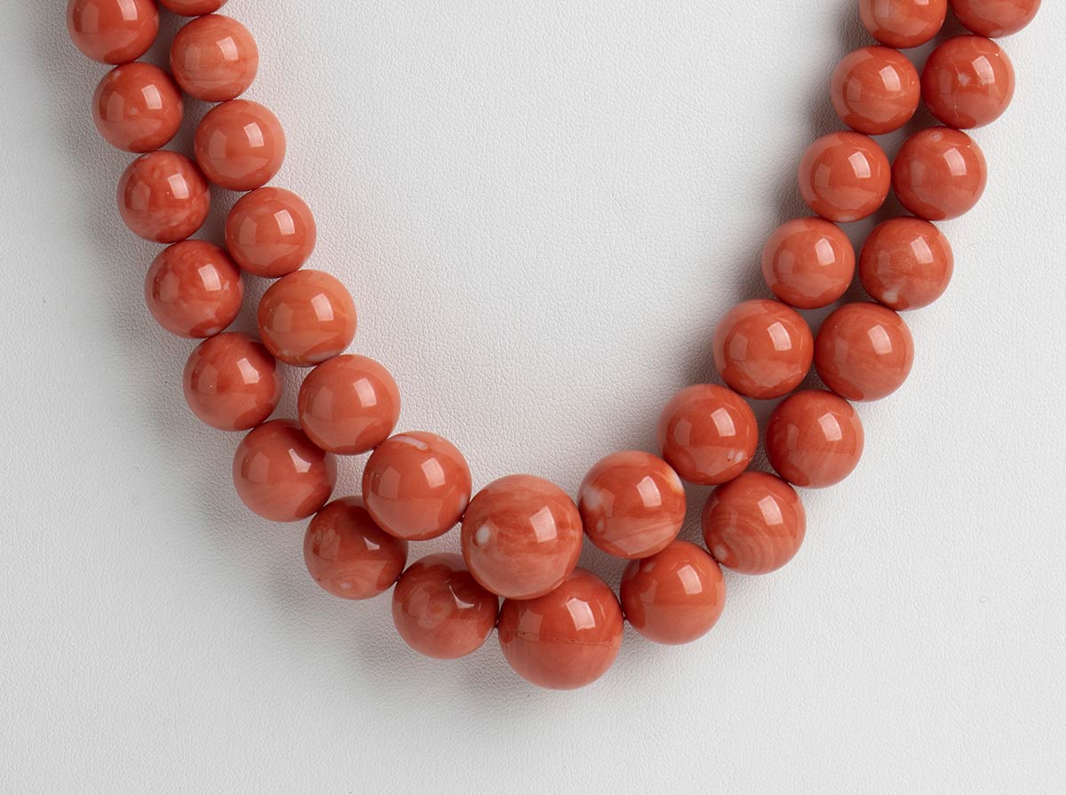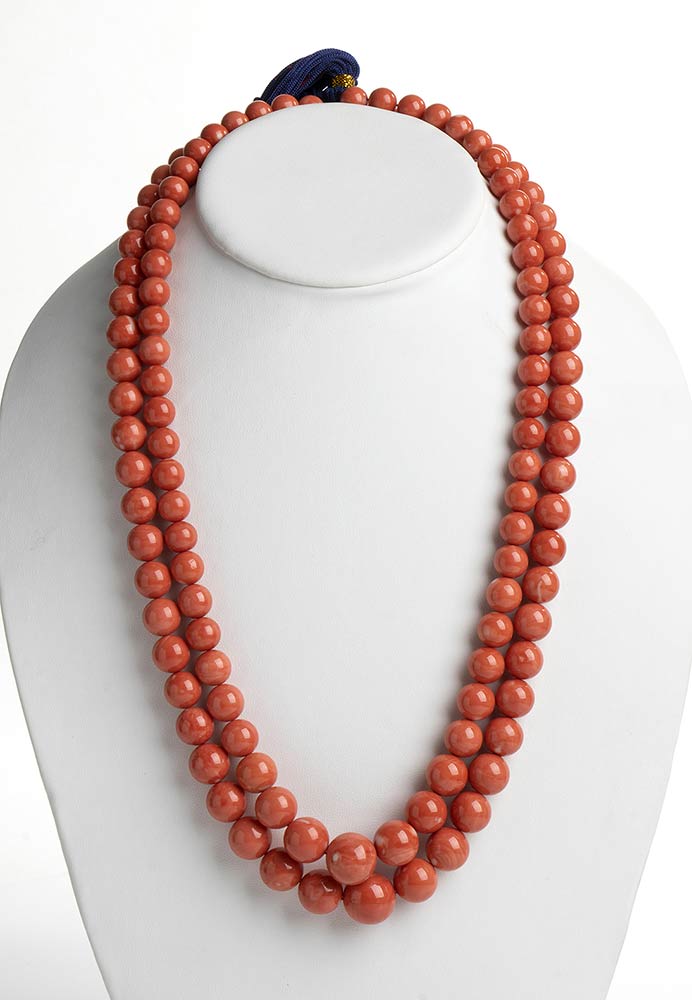 Collana a due fili in corallo Momo o Cerasuolo (Corallium Elatius) composta da 116 (59+57) sfere lisce disposte in gradazione. Senza fermezza. Manifattura Guarracino, Torre del Greco. Lunghezza 68 cm, diametri sfere 15,7 - 13 - 10 mm. Peso totale 266 gr. Stato di conservazione: *****ottimo.