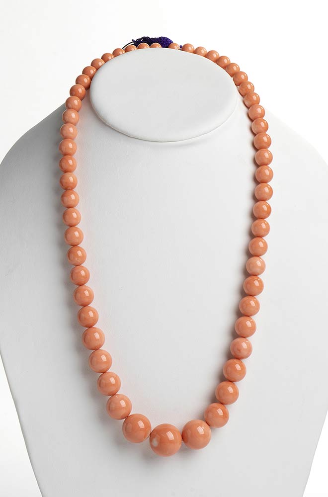 Collana in corallo Bokè (Corallium Secundum) composta da 55 sfere lisce disposte in gradazione. Senza fermezza. Manifattura Guarracino, Torre del Greco. Lunghezza 67,5 cm, diametri sfere 21 - 12 - 9 mm. Peso totale 162 gr. Stato di conservazione: *****ottimo.