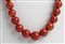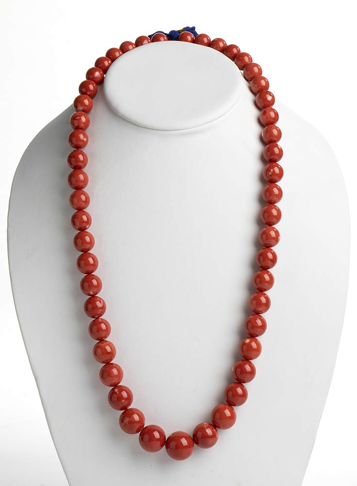 Collana in corallo Momo o Cerasuolo (Corallium Elatius) composta da 49 sfere lisce disposte in gradazione. Senza fermezza. Manifattura Guarracino, Torre del Greco. Lunghezza 70 cm, diametri sfere 20 - 15 - 12 mm. Peso totale 218 gr. Stato di conservazione: *****ottimo.