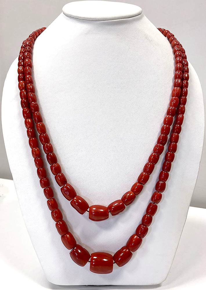 Collana a due fili in corallo Aka o Moro (Corallium Laponicum) composta da 131 barilotti lisci disposti in gradazione. Senza fermezza. Manifattura Guarracino, Torre del Greco. Lunghezza 67 cm (corto), diametri sfere 21 - 10 - 7 mm. Peso totale 227,7 gr. Stato di conservazione: *****ottimo.
