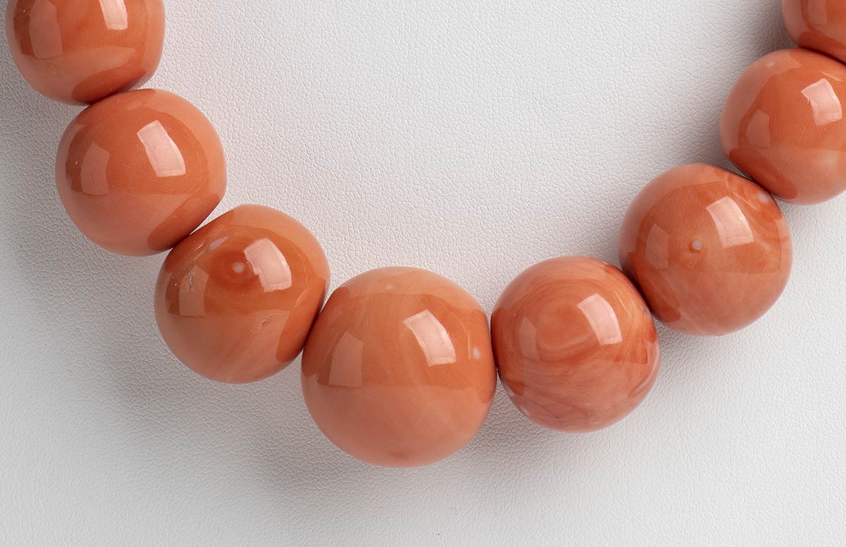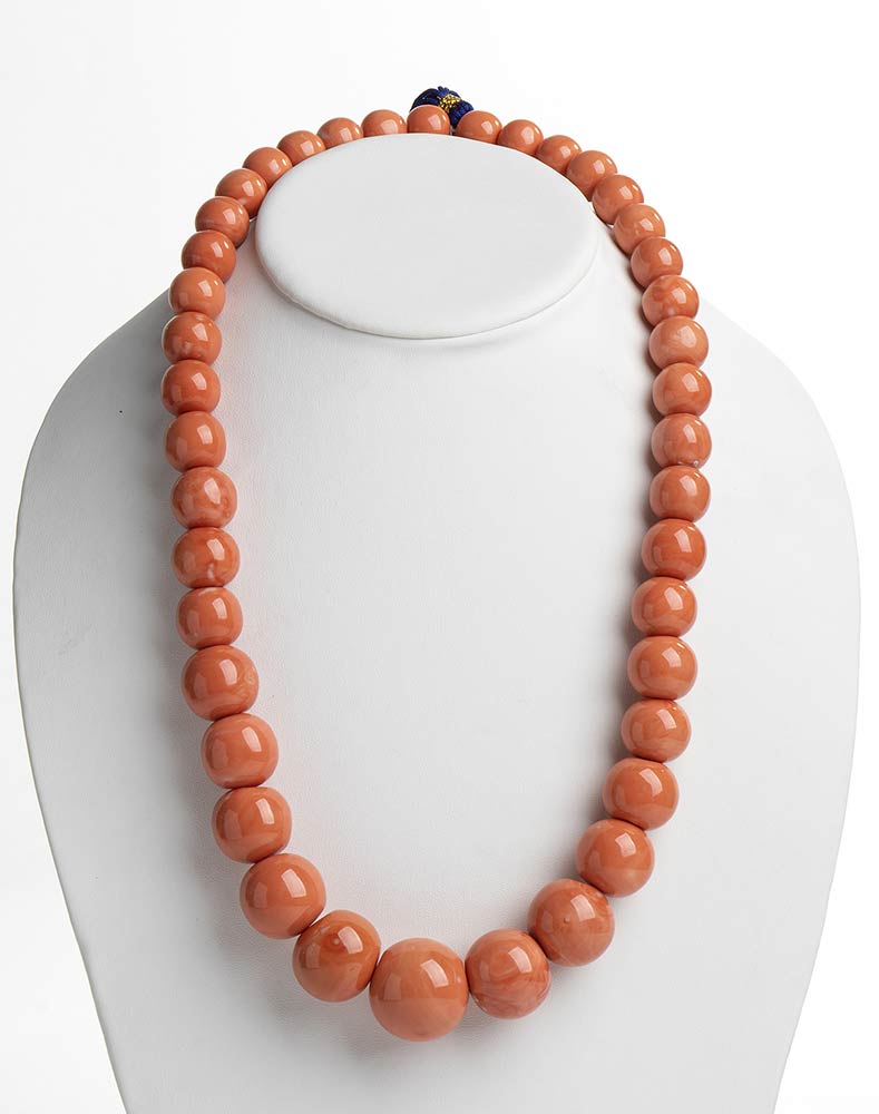 Collana in Momo o Cerasuolo (Corallium Elatius) composta da 41 sfere lisce disposte in gradazione. Senza fermezza. Manifattura Guarracino, Torre del Greco. Lunghezza 66 cm, diametri sfere 27 - 18 - 13 mm. Peso totale 354 gr. Stato di conservazione: *****ottimo.