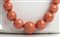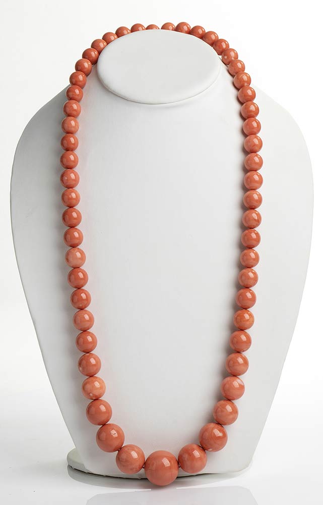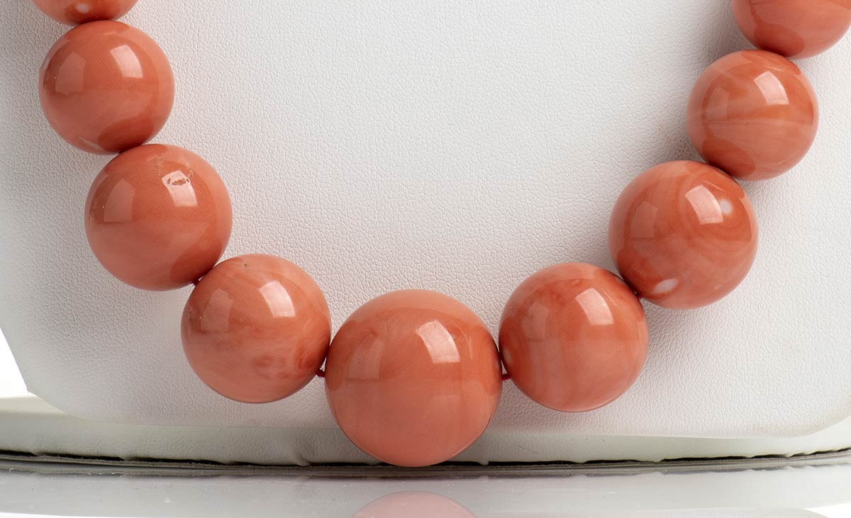 Collana in Momo o Cerasuolo (Corallium Elatius) composta da 61 sfere lisce disposte in gradazione. Senza fermezza. Manifattura Guarracino, Torre del Greco. Lunghezza 48,5 cm, diametri sfere 26 - 14,5 - 11,5 mm. Peso totale 344 gr. Stato di conservazione: *****ottimo.