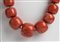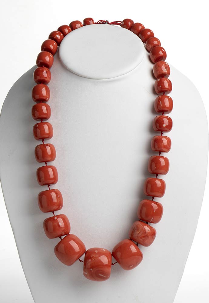 Collana in corallo Momo o Cerasuolo (Corallium Elatius) composta da 31 barilotti lisci disposti in gradazione. Senza fermezza. Manifattura Guarracino, Torre del Greco. Lunghezza 67,5 cm, diametri sfere 37 - 23 - 15 mm. Peso totale 565 gr. Stato di conservazione: *****ottimo.