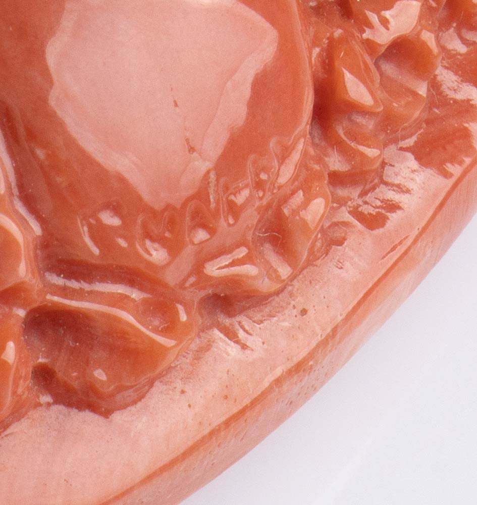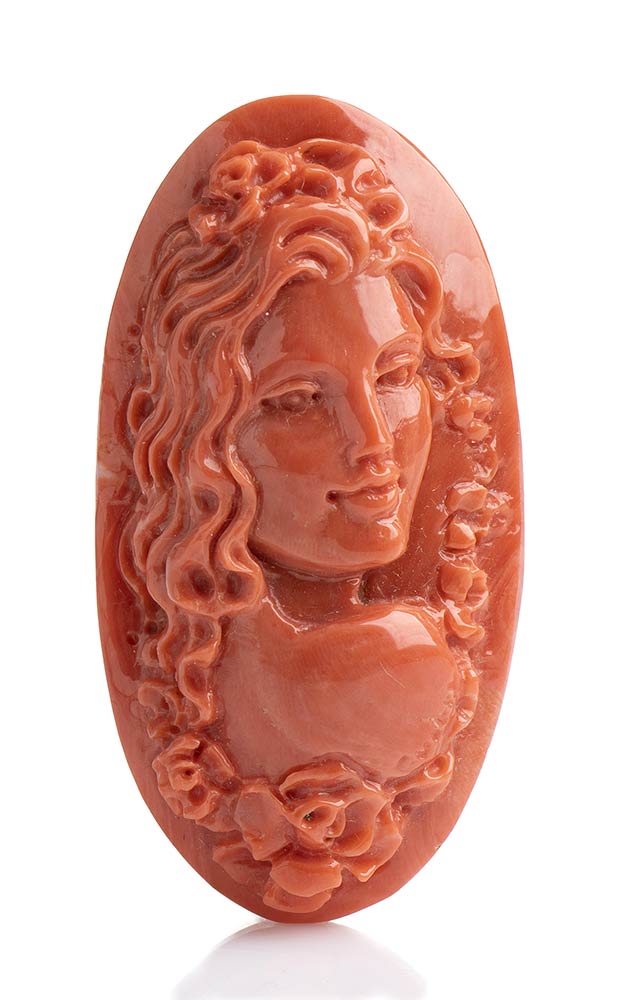 Scultura in corallo Momo o Cerasuolo (Corallium Elatius) raffigurante il volto di "Flora". Manifattura Guarracino, Torre del Greco. Dimensioni 60 x 31,5 mm. Peso 41,5 gr. Stato di conservazione: *****ottimo.