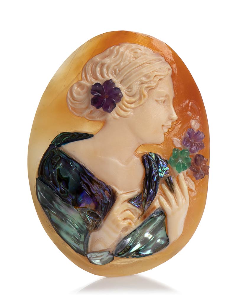 Cammeo su corniola con applicazioni in madreperla e agata - Manifattura Guarracino, Torre del Greco