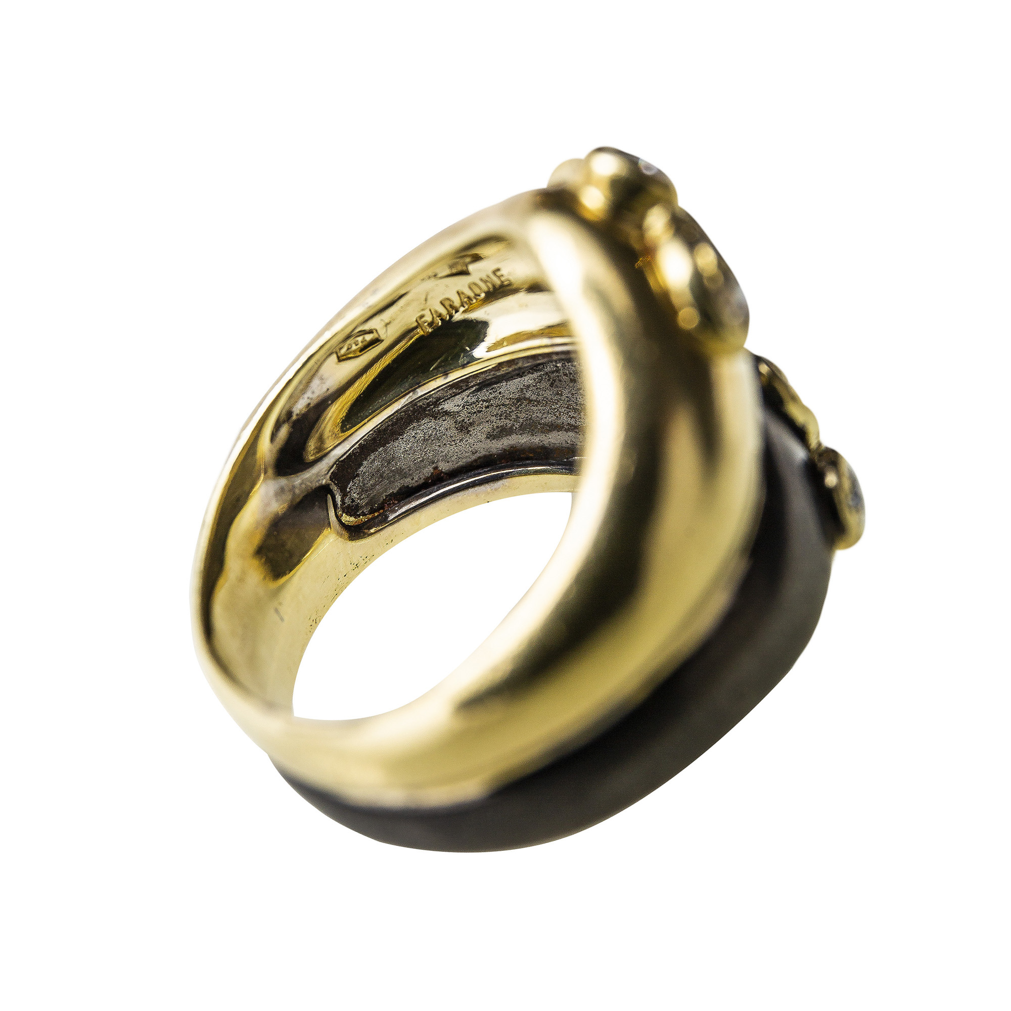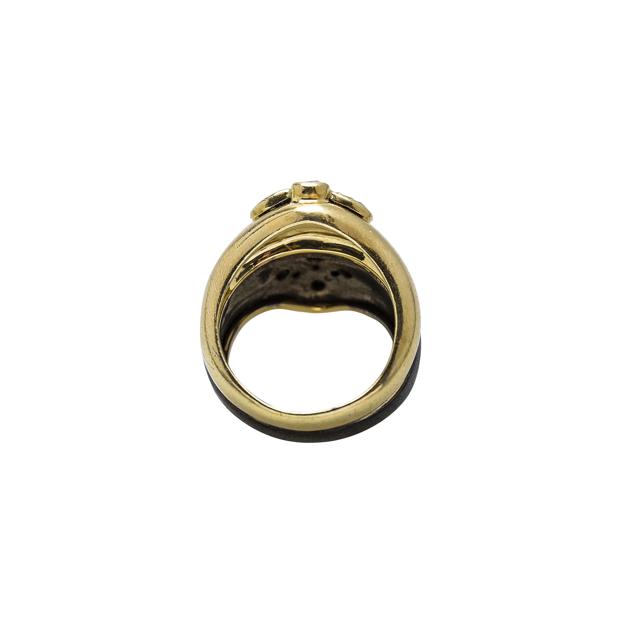 Anello in oro giallo 18 Kt e oro rodiato con decorazione a fiore impreziosita da diamanti (0.20 ct). Marchio all'interno. Il peso è di 11,50 gr. Misura ITA 10 Misura USA 5 1/2