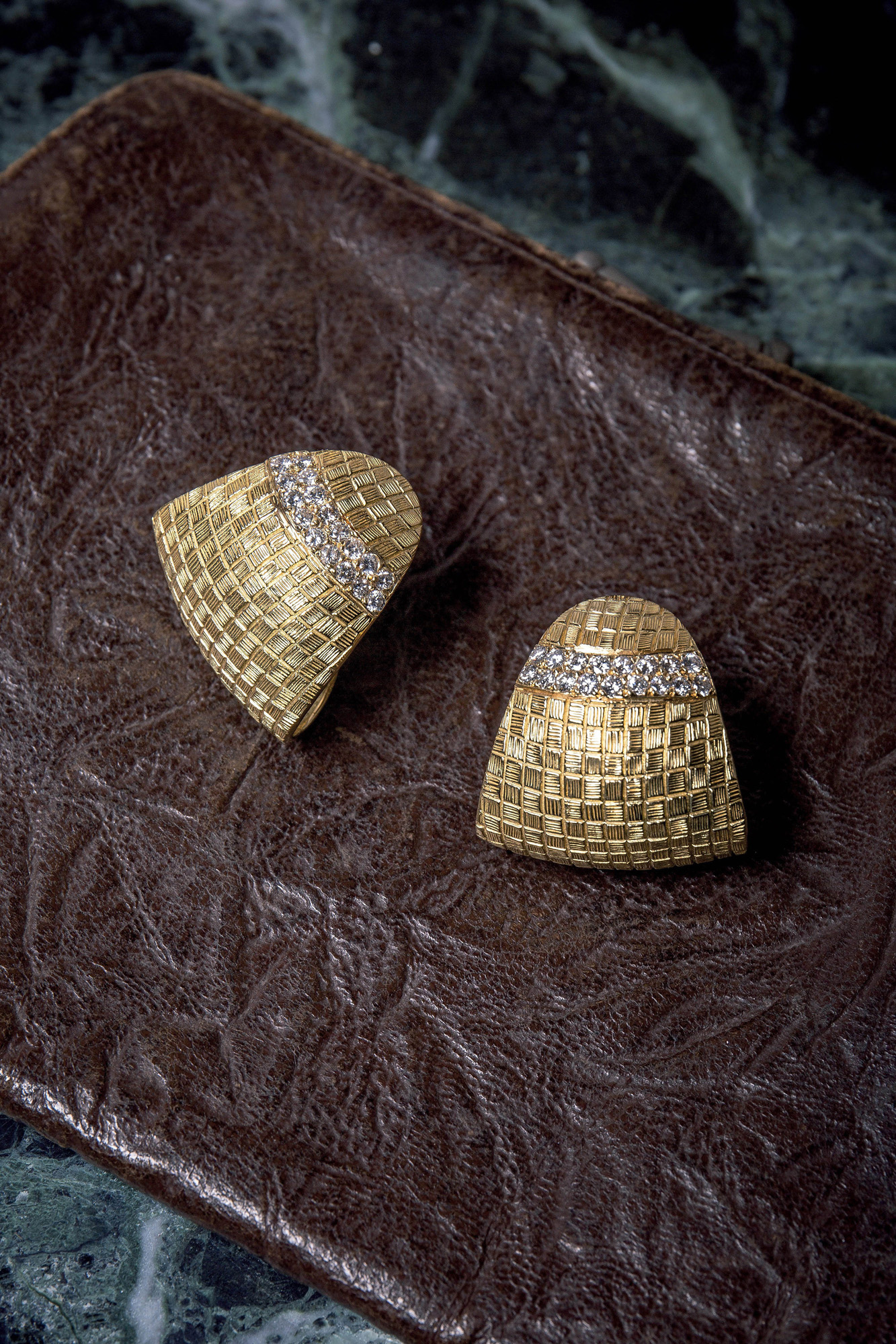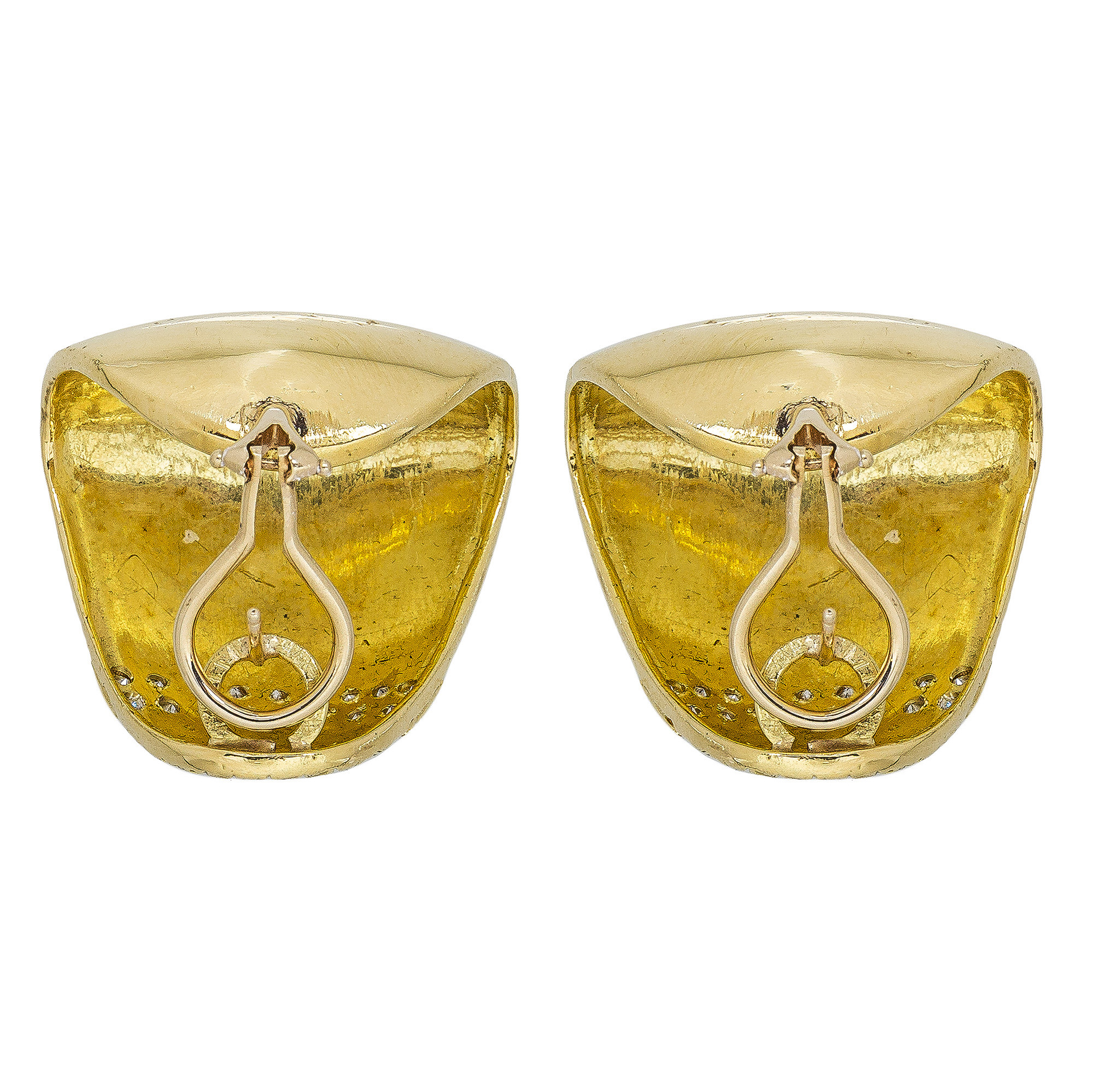 Orecchini, anni '60/'70, in oro giallo satinato 18 Kt con elegante motivo a piccoli riquadri; ciascuno impreziosito da due file di diamanti (1,30 ct ca.). Il peso è di 35,20 gr. Trattasi di orecchini per lobi forati.