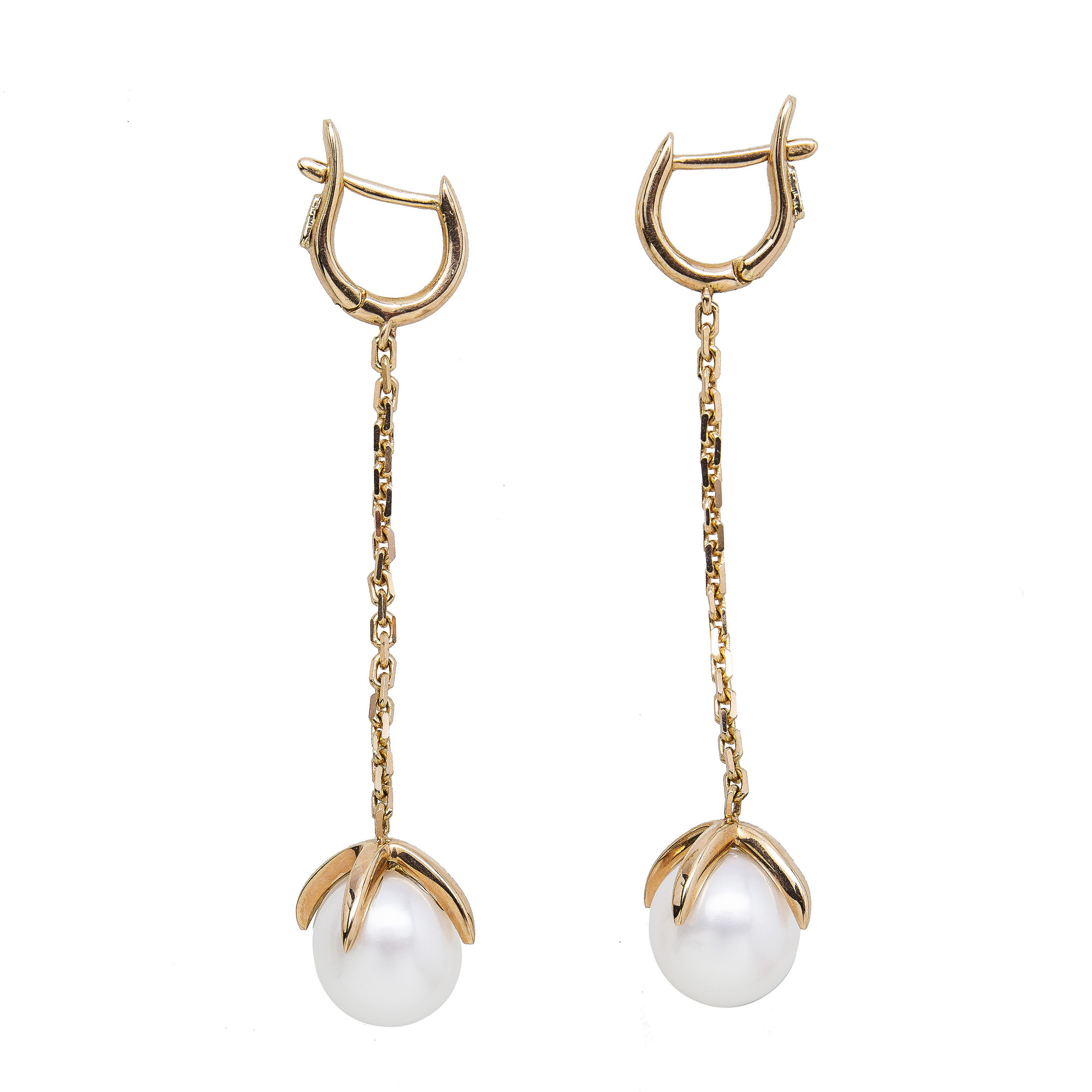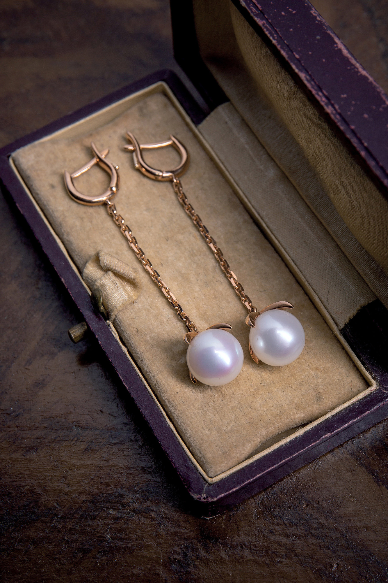 Orecchini pendenti in oro rosa realizzati con una catenina terminante con una perla d'acqua dolce. Il peso è di 7,70 gr Trattasi di orecchini per lobi forati.