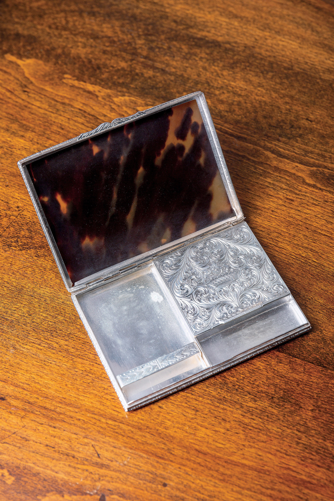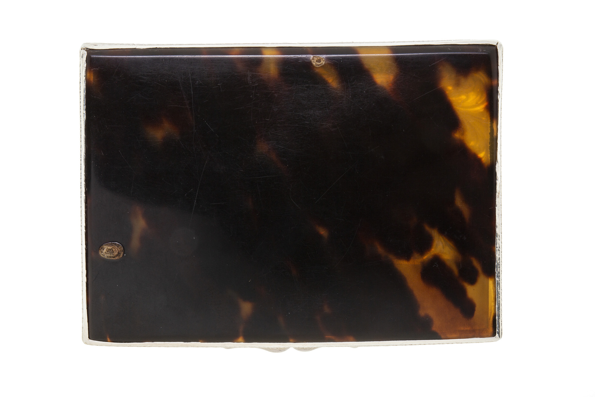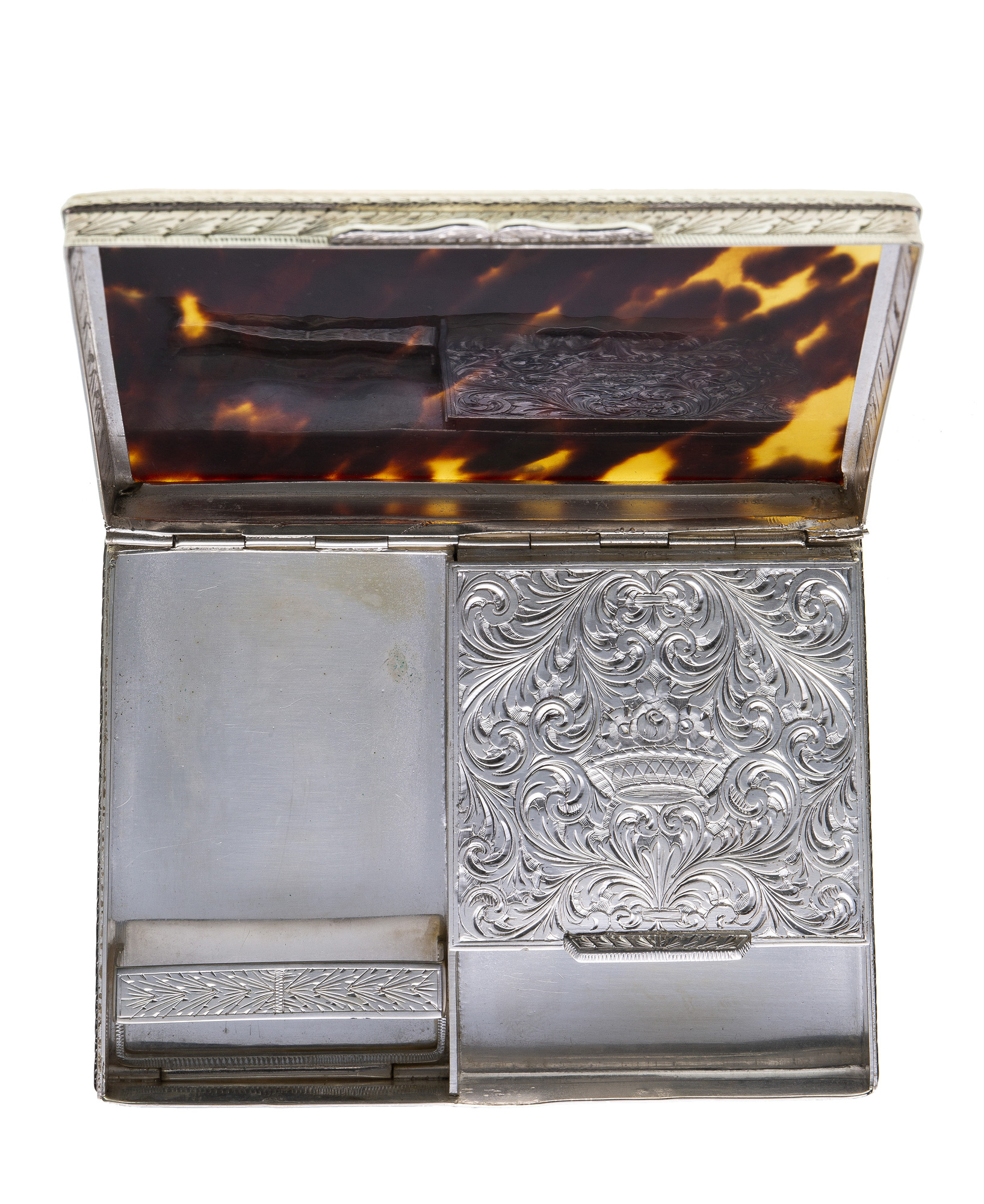 Trousse di forma rettangolare in tartaruga e argento 800 cesellato. L'interno presenta piccoli scomparti. Il peso è di 173,00 gr.