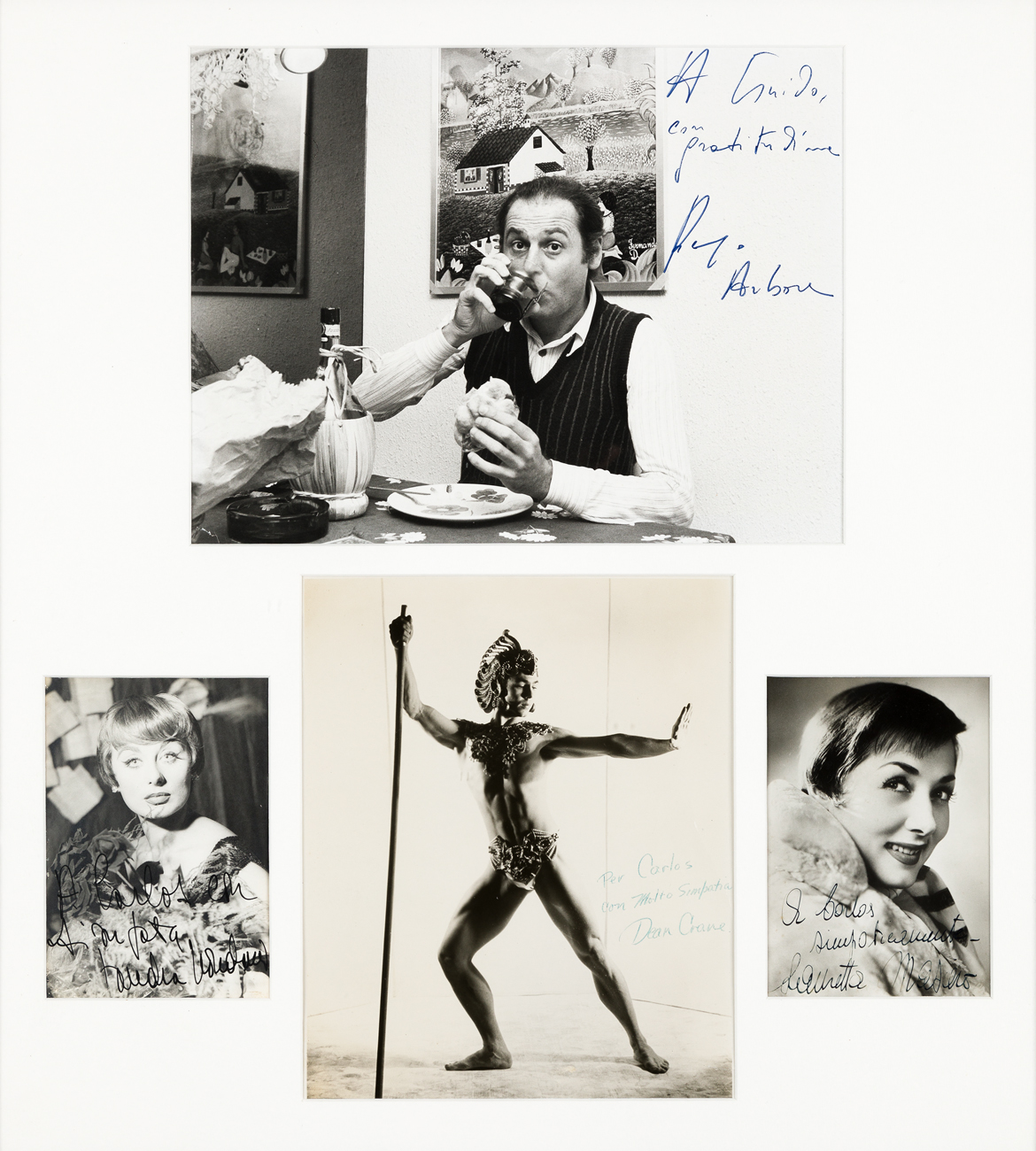 Lotto unico composto da 4 fotografie, ciascuna recante autografo (Renzo Arbore, Sandra Mondaini, Dean Crane, Lauretta Masiero)