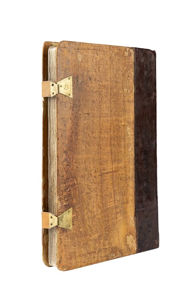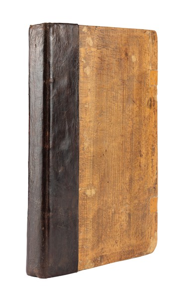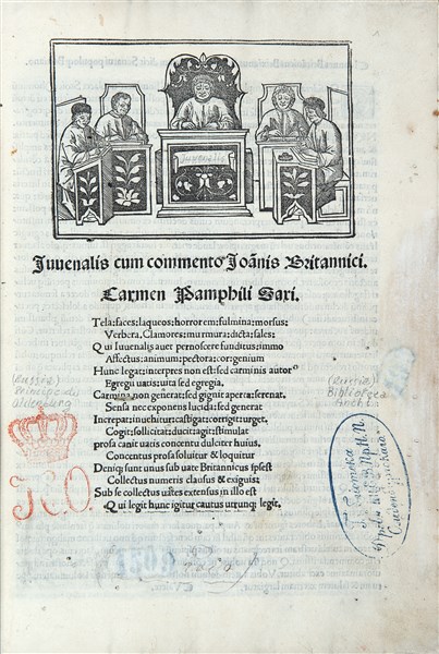 Folio (308 x 212mm). Large woodcut vignette on the title depicting Juvenal with the disciples seated on the benches, and other 15 smaller sized woodcuts at the incipits, historiated woodcut initials, text within commentary in smaller body, with final blank (some wormholes in the text, small wormtrack with slight loss to the first and final leaves, another wormtrack that does not touch the text in the inner margin of the central leaves, expert repair on the verso of the title without loss). Reassembled binding with contemporary wooden plates and later calf on spine, later metal clasps (modern guards). Provenance: Prince of Oldenburg (stamp on title ) - old Russian library stamp and number on title - Marcellus Schlimovich (bookplate) - Argentine Jewish Society (labels at the beginning and end of the volume) - Vicotir Azienman (Buenos Aires bookshop) - Maria Luisa Manticelli (modern bookplate) - Gonnelli auction house (label).