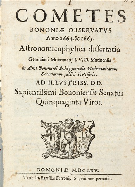 Prima edizione della prima pubblicazione di Montanari con le osservazioni sul passaggio della famosa cometa del 1664-1665, osservata da Bologna. Lo scienziato, nella cui opera sono numerosi i riferimenti a Galileo, Cassini, Keplero, fu non solo uno stimato studioso ma anche uno sperimentatore, costruttore di lenti, telescopi e strumenti di misurazione.