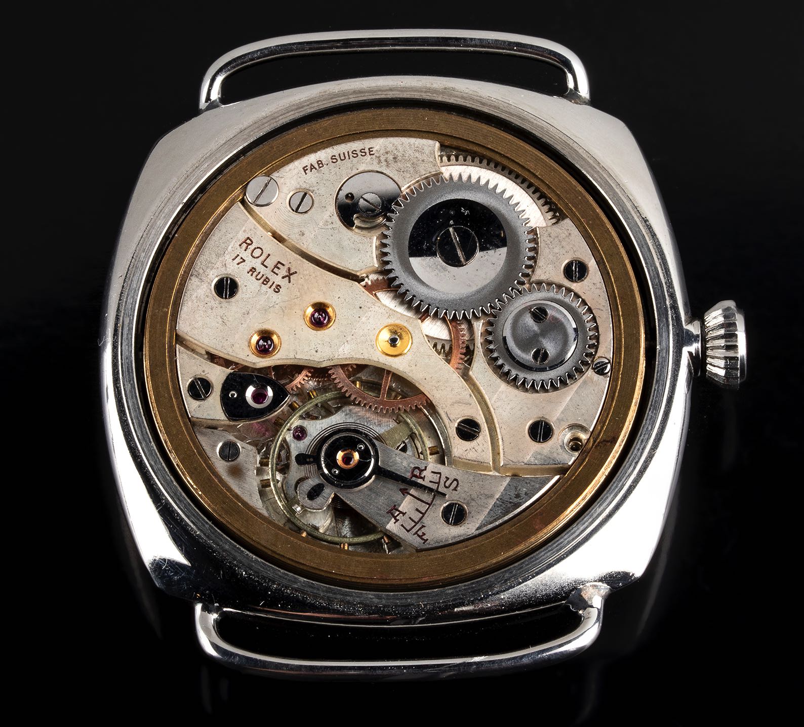 Oversized cushion shape with screw back case stainless steel signed Rolex, 47 mm.