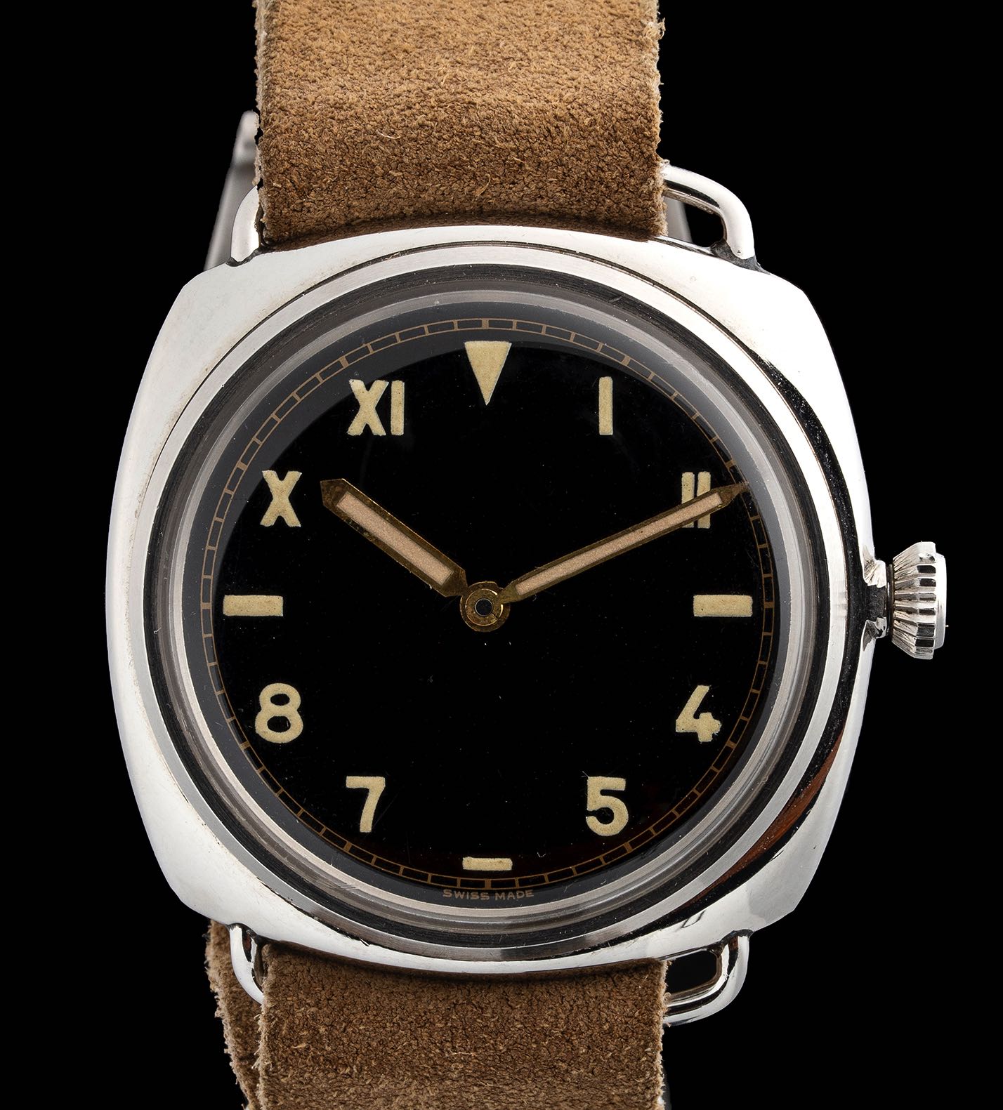 According to scholarship, 211 examples are known of the reference, having begun production in 1940. Established in 1860 in Florence, Italy, Officine Panerai was a purveyor of specialized precision instruments like compasses and dive gauges, and by the turn of the twentieth century, the firm manufactured wristwatches. Today, their vintage watches are design icons, easily identified by their oversized cushion-shaped case and clear legible dial. Panerai experimented with various compounds to produce a new luminous material that would be brighter and more effective for their underwater instruments. The luminous powder was named “Radiomir” and patented in France in 1916. Following three years of testing beginning in 1935, they began supplying highly specialized dive watches to the Royal Italian Navy. Evolved from Panerai’s prototype model, the reference 2533, their second model was the reference 3646, produced from 1938 to the early 1950s with variants classified from Type A to Type G, each bearing unique aesthetics. Manufactured by Rolex for Panerai, the present lot is fitted with a stunning, black “California-type” dial – a design patented by Rolex in 1941 with half Arabic and half Roman numerals – that retains its gorgeous, original glossy surface. The well-preserved 47mm stainless steel case houses a Rolex-signed movement – the manually-wound caliber 618. Case, movement signed