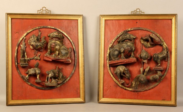Firmato, datato. Coppia di altorilievi in legno laccato, dorato e intagliato raff. ''ANIMALI''. Cina. XIX secolo. Mis. Lung. cm. 25,5 Alt. cm. 30,5 ca.