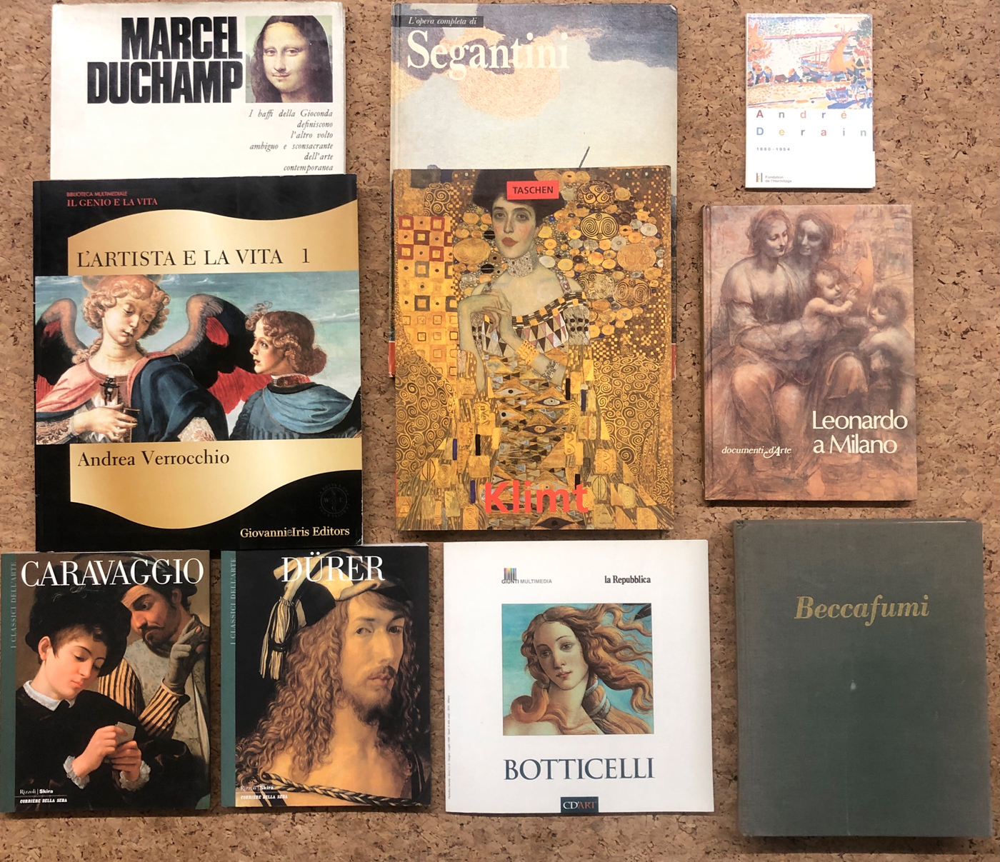 Lotto unico di cataloghi relativi ai seguenti artisti: Botticelli, Caravaggio, Leonardo da Vinci, Segantini, Klimt, Andrea Verrocchio, Marcel Duchamp, Albrecht Dürer, André Derain, Domenico Beccafumi