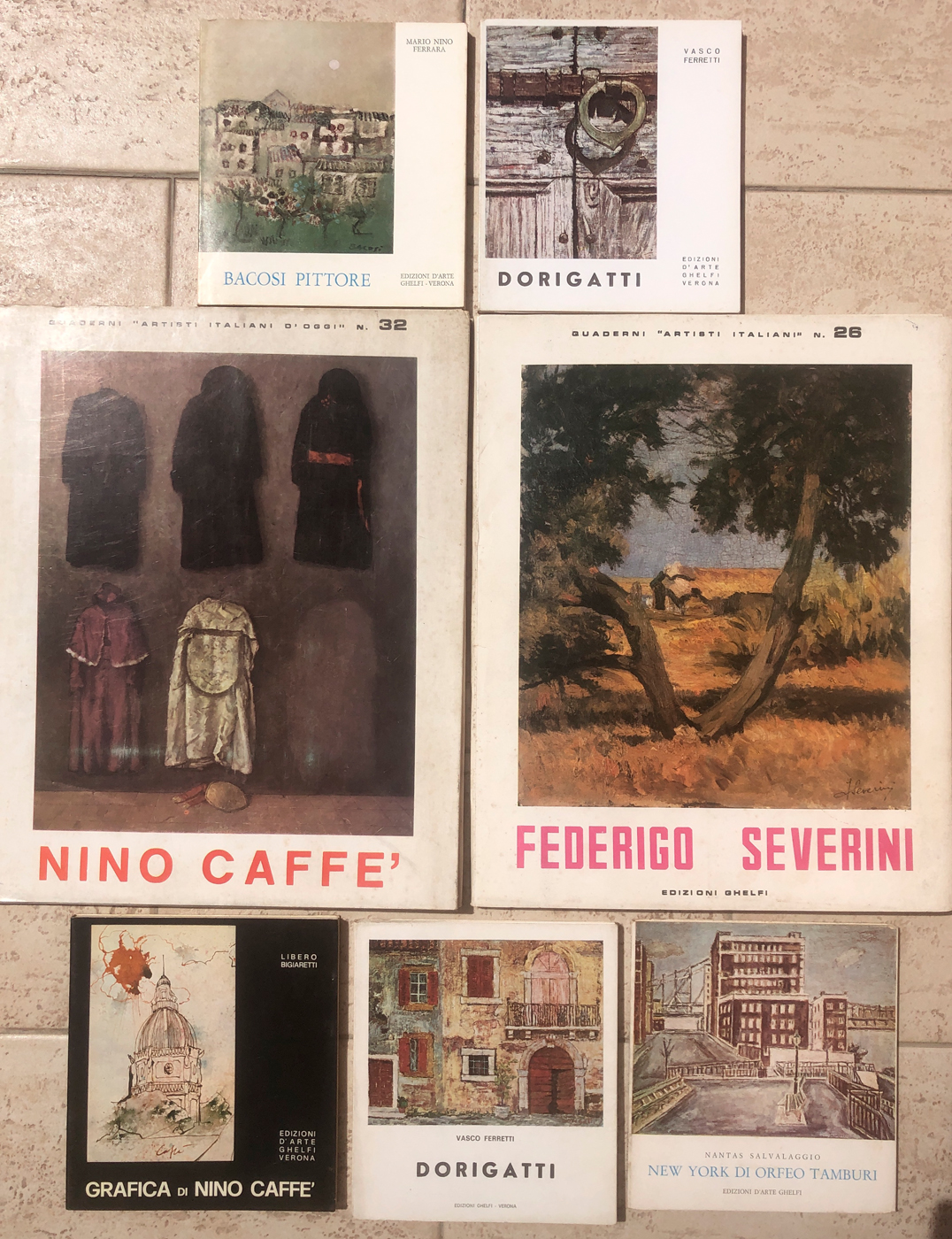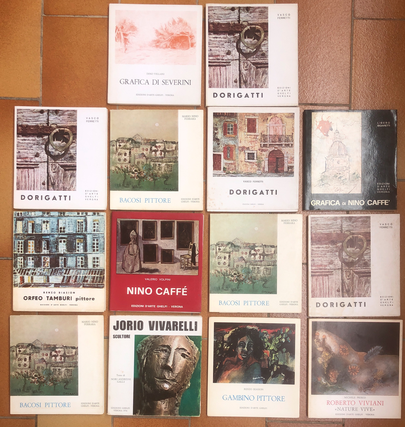 Lotto unico di 36 piccoli cataloghi riccamente illustrati editi dalla Galleria Ghelfi, Verona, nel corso degli anni '70 e riferiti ai seguenti artisti: Simonetti, Severini, Piacesi, Dorigatti, Bacosi, Caffè, Tamburi, Fabbri, Vivarelli, Gambino, Viviani