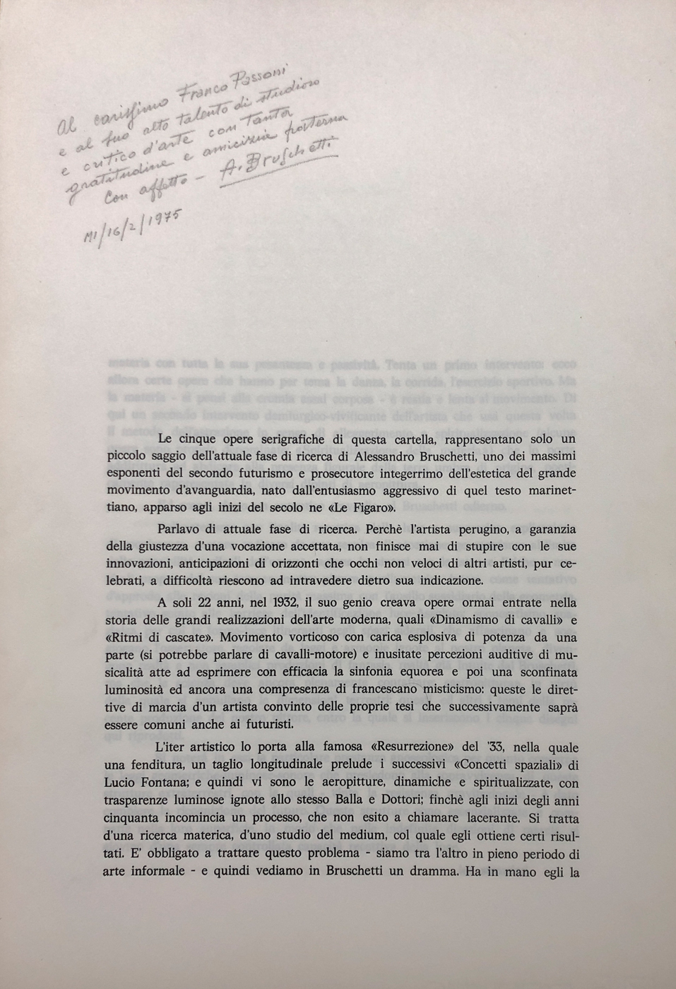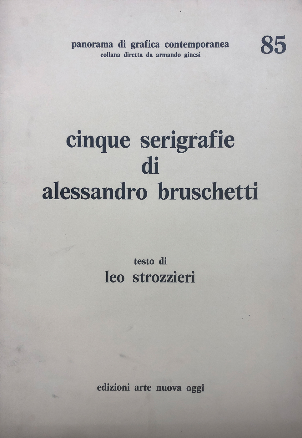 Cartella composta da testo di presentazione di Leo Strozzieri e 5 serigrafie di Alessandro Bruschetti, ciascuna recante firma e numerazione (Esemplari 34/100) a matita al fronte e timbro a secco ‘Arte Nuova Oggi - Made in Italy’