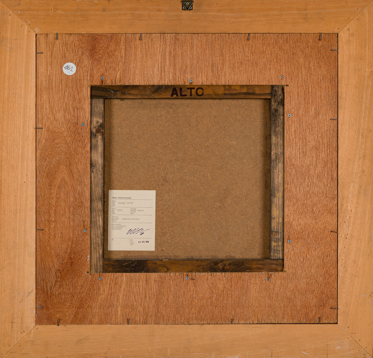 Etichetta dell'Artista al retro con firma, titolo, tecnica, misure e datazione al retro