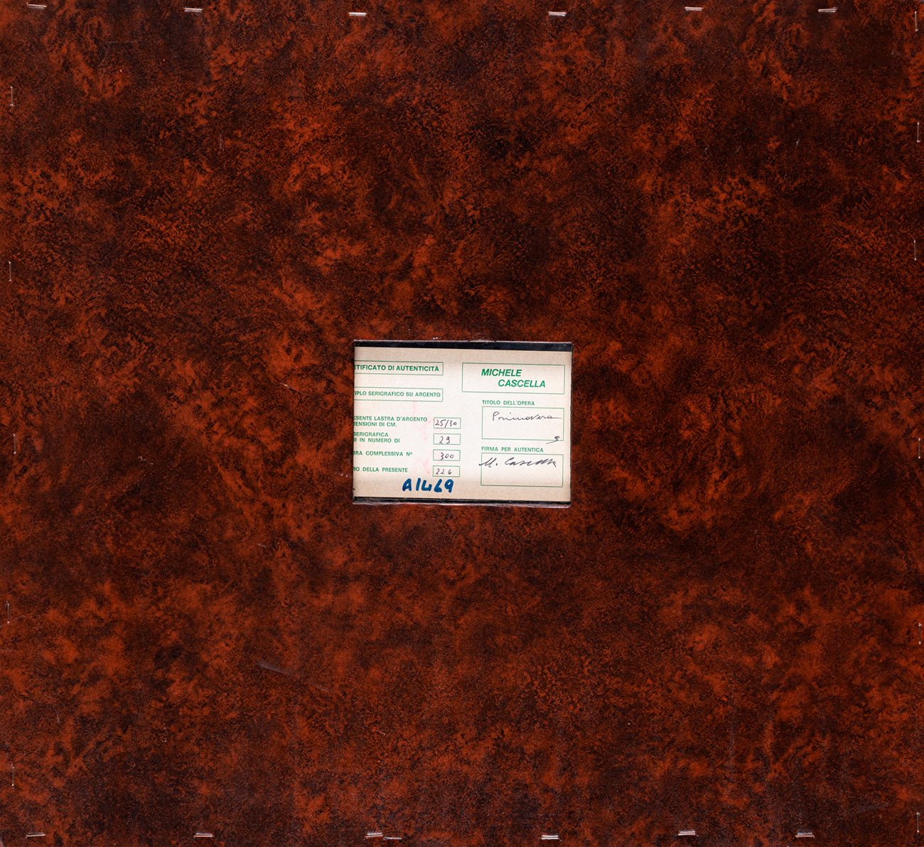 Certificato di autenticità applicato al retro con indicazione della numerazione, titolo e firma