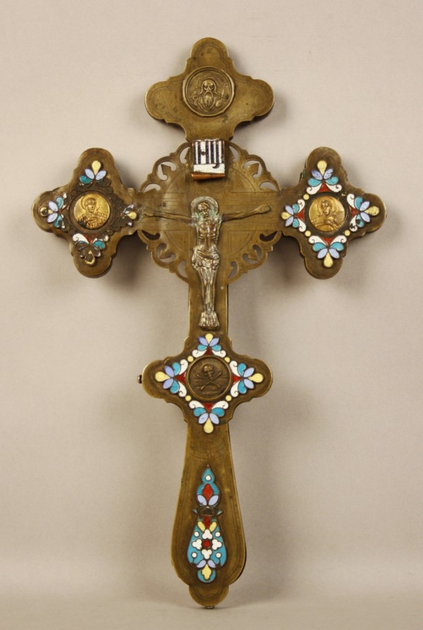 Crocifisso in bronzo con smalti. Russia. XVIII secolo. Mis. Lung. cm. 19 Alt. cm. 31 ca.