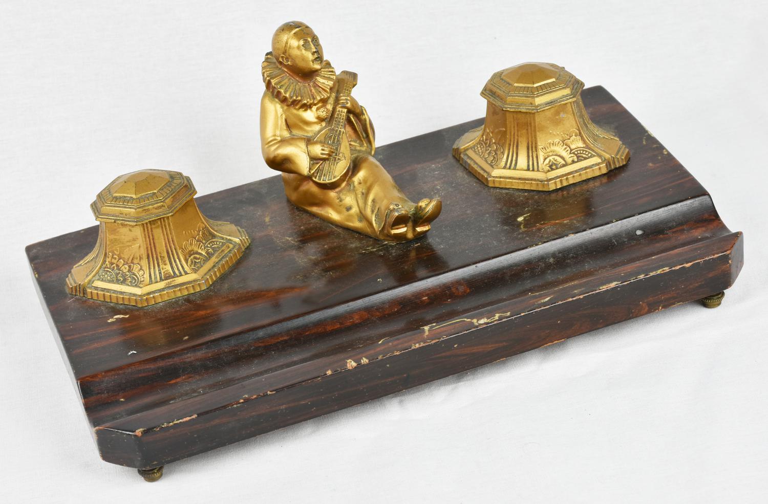 CALAMAIO IN LEGNO con scultura in antimonio dorato raffigurante Pierrot che...