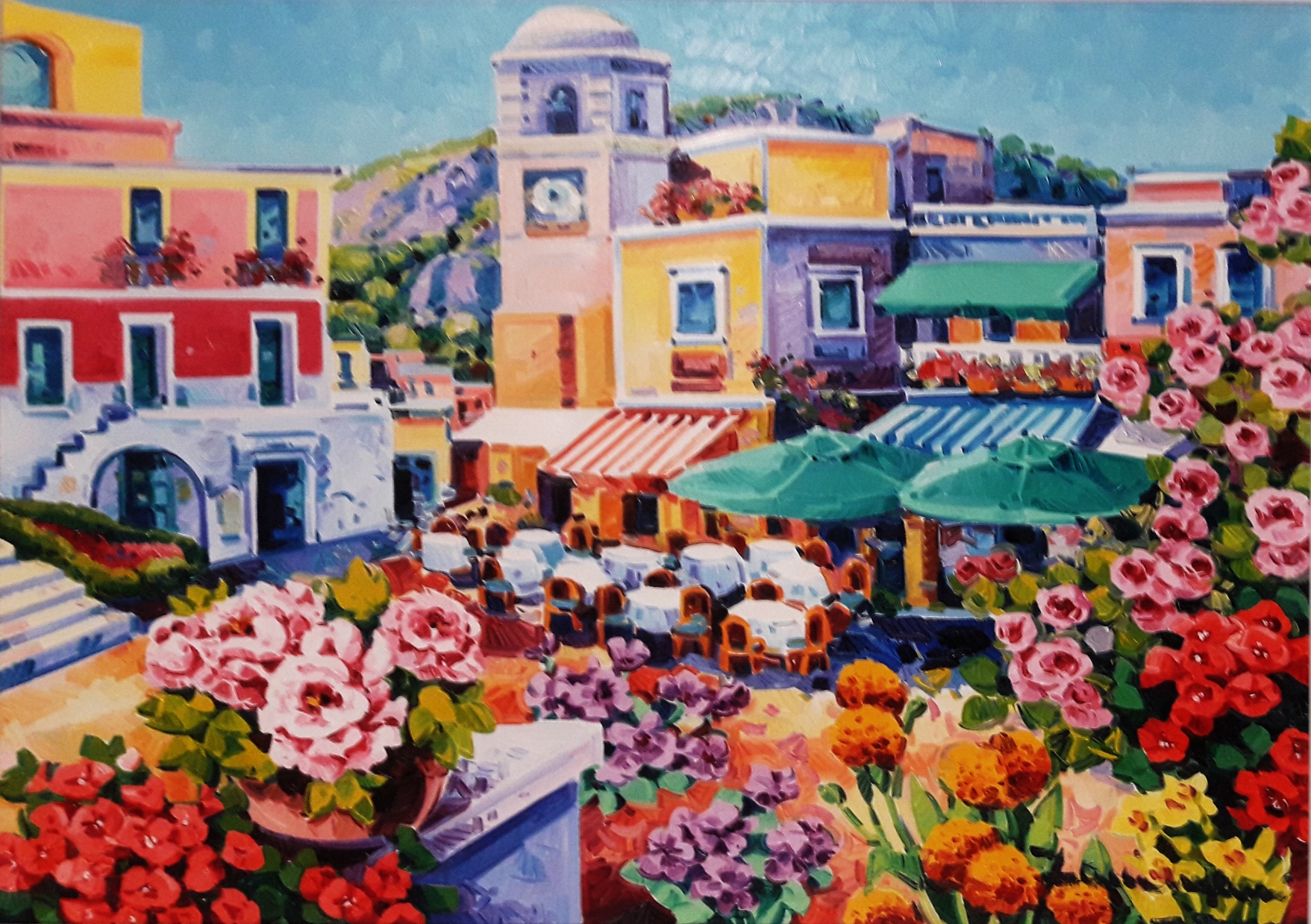 "Da piazzetta di Capri e poesia di primavera” olio su tela cm 50x70. Firmato sul fronte in basso a destra, sul retro firmato ed intitolato. Autentica su foto.
