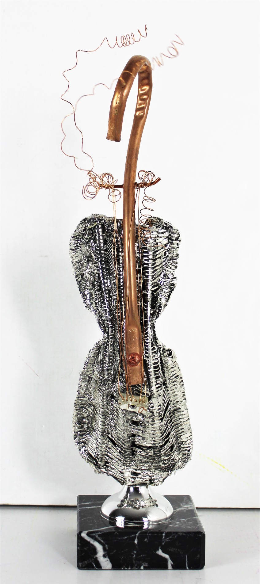 M’HORO’ "Violino", scultura in resina epossidica laminata in argentoe innesti in rame. Firmata di pugno dall’autore cm 42x10x8, multiplo esemplare A31/50, autentica e archiviazione su foto.