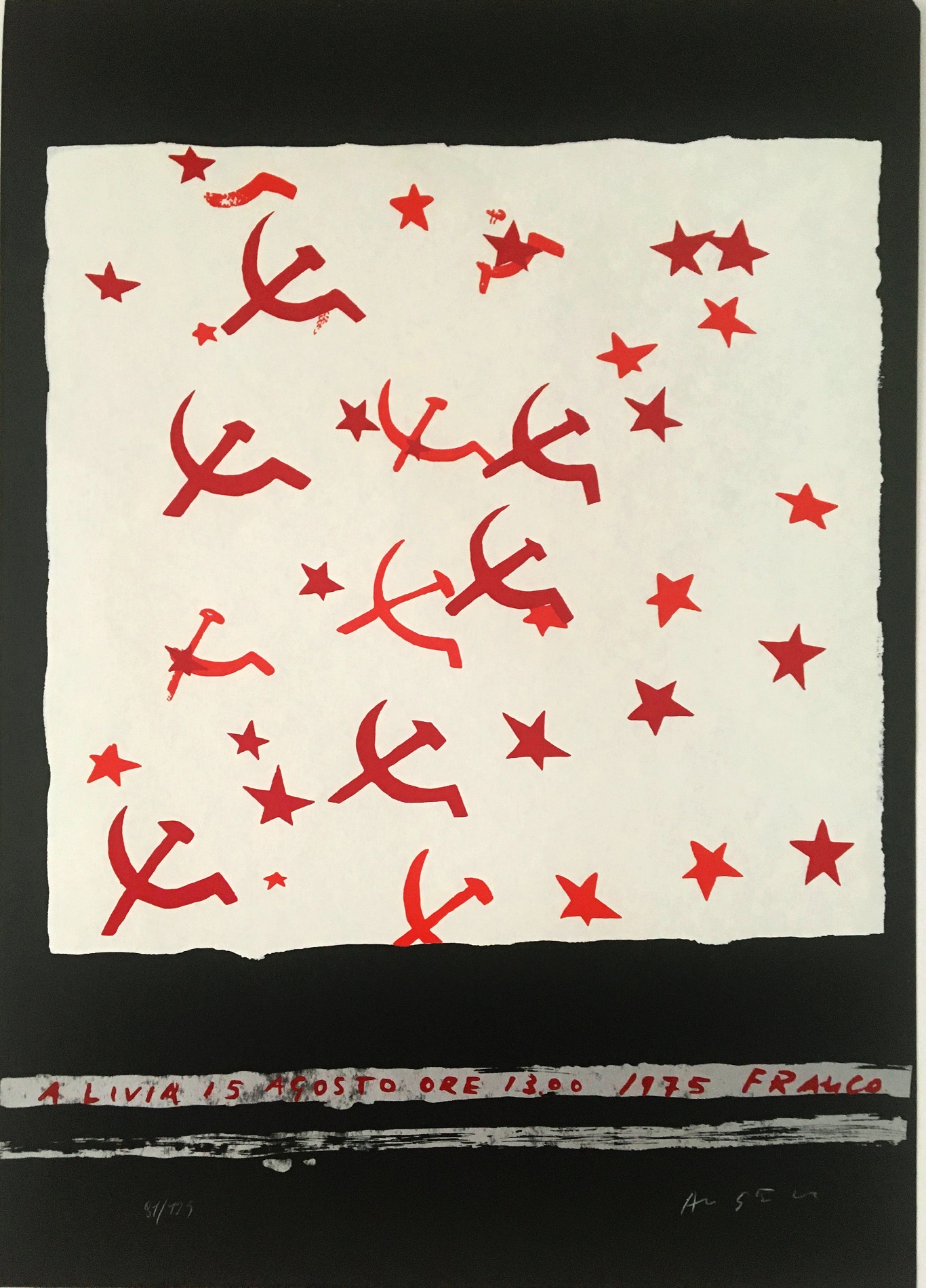 ANGELI FRANCO Roma 1935 - Roma 1988"Senza Titolo" Serigrafia su cartoncino cm 70x50, firmata in basso a destra e numerata in basso a sinistra 91/125. Datata, firmata e dedicata in basso.