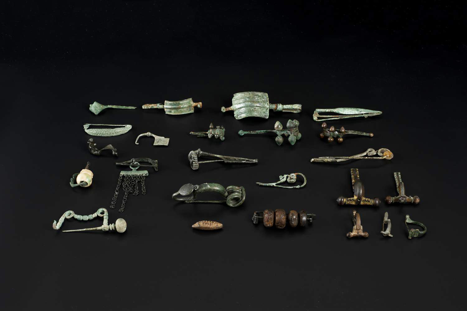 Ventitre fibule in bronzo di differenti culture, forme ed epoche; una ghianda missile in piombo con iscrizione (24)