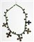 Collana con vaghi in pasta vitrea verde e piccole sfere in bronzo, con cinque pendenti in bronzo a croce greca decorate a champlevé con smalti bianchi.
