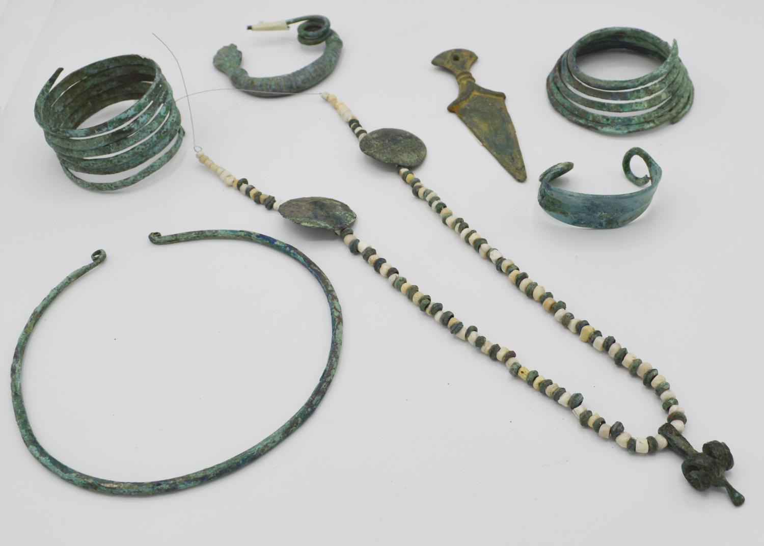 Corredo composto da una collana con vaghi in calcare bianco e bronzo, un pendente a serpente stilizzato e due elementi a scudo circolare in bronzo; un torque in verga di bronzo; una grande fibula ad arco semplice, una piccola armilla in lamina con estremità a ricciolo, due grandi armille spiraliformi in verga di bronzo ed un modellino di daga a lama triangolare. (7)
