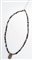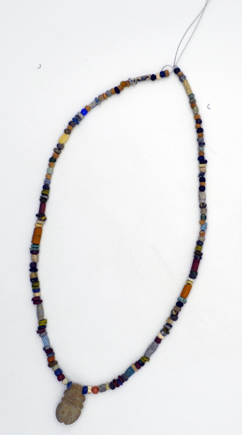 Collana con vaghi in pasta vitrea di differenti forme, colori ed epoche con pendente centrale costituito da una piccola dea madre steatopigia yemenita, fortemente stilizzata.