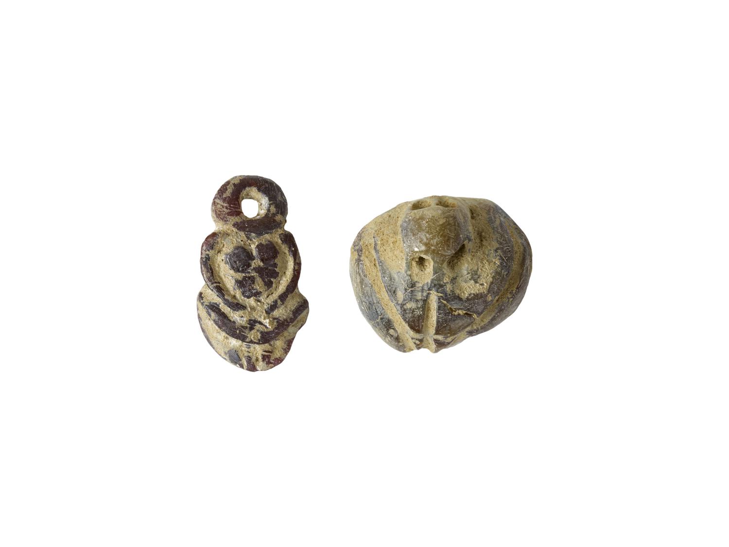 Due statuette di dee madri steatopigie raffigurate una stante con braccia sul ventre, gambe, seni e sesso stilizzati e con foro orizzontale per essere usata come ciondolo; l'altra raffigurata seduta in posizione raccolta, fortemente stilizzata, con incisione a croce nella parte inferiore (2)